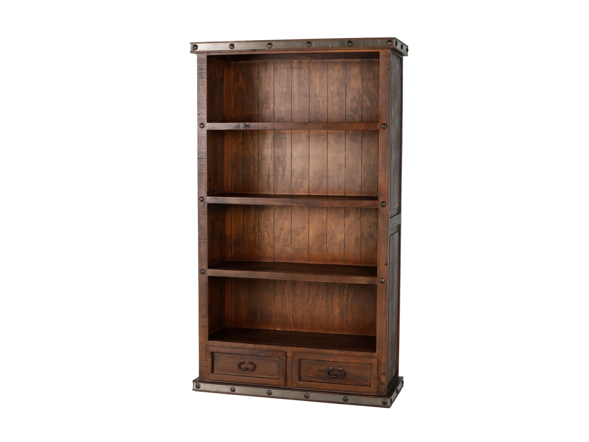 The Grand Hacienda 2 Drawer Bookcase, a stunning addition to any rustic-style setting. Made from 100% distressed pine wood, this bookcase from our Mexican dark stain collection exudes old-world charm while featuring modern touches with a lacquer seal. With four spacious shelves for binders, textbooks, and decor, it also boasts two small bottom drawers for added storage. The decorative metal band with clovas or nail heads, relief panels on the sides, and wrought iron forged hardware enhance its rustic appeal, while metal drawer glides ensure smooth functionality.