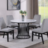 This dining set is a sophisticated blend of contemporary design and artistic flair, ideal for modern homes seeking a touch of elegance. The set features a sleek, round table with a faux marble top that is both beautiful and easy to care for. The table's base is a sculptural marvel, with a dynamic, cage-like structure that is as sturdy as it is stylish. Accompanying the table are plush chairs upholstered in a high-quality, textured fabric, their high backs and cushioned seats offering utmost comfort. The chairs' bold frames contrast with the light upholstery, adding a striking visual interest to the set.