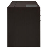 A basic piece with tasteful upgrades, this computer desk stays atop tech needs while offering a fresh, modular aesthetic. Finished in deep cappuccino, it offers versatility and bold style. Find everything you need for smooth computing, including two drawers and a keyboard drawer with Euro glides, and a storage cabinet with an adjustable shelf. Components and devices are viewable through a clear tempered glass insert on the desktop. Enjoy the convenience of a power outlet within lift-top storage.