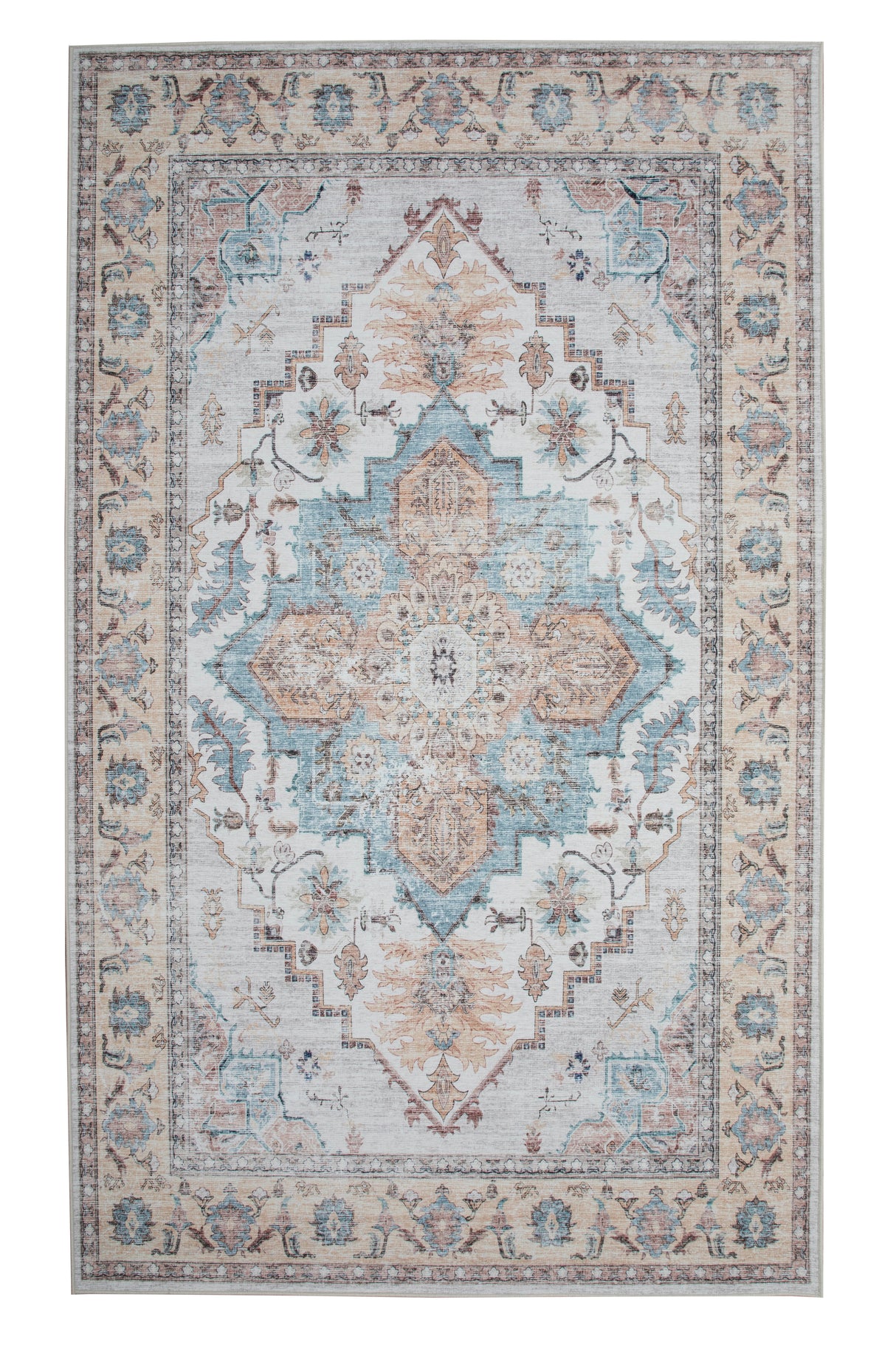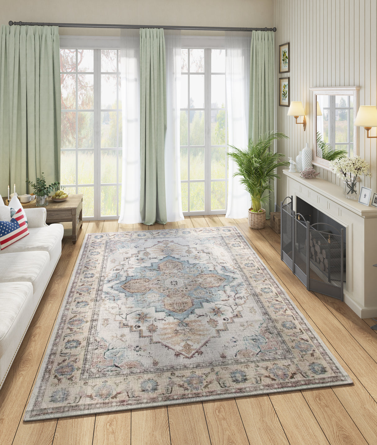 Elevate your space with this beautifully designed 6' x 9' vintage-inspired area rug. Featuring a harmonious blend of soft neutrals, elegant blue, and warm earth tones, this rug brings timeless charm and sophistication to any room. Its intricate medallion pattern and distressed finish create an inviting, lived-in feel that complements a variety of interior styles, from classic to contemporary.