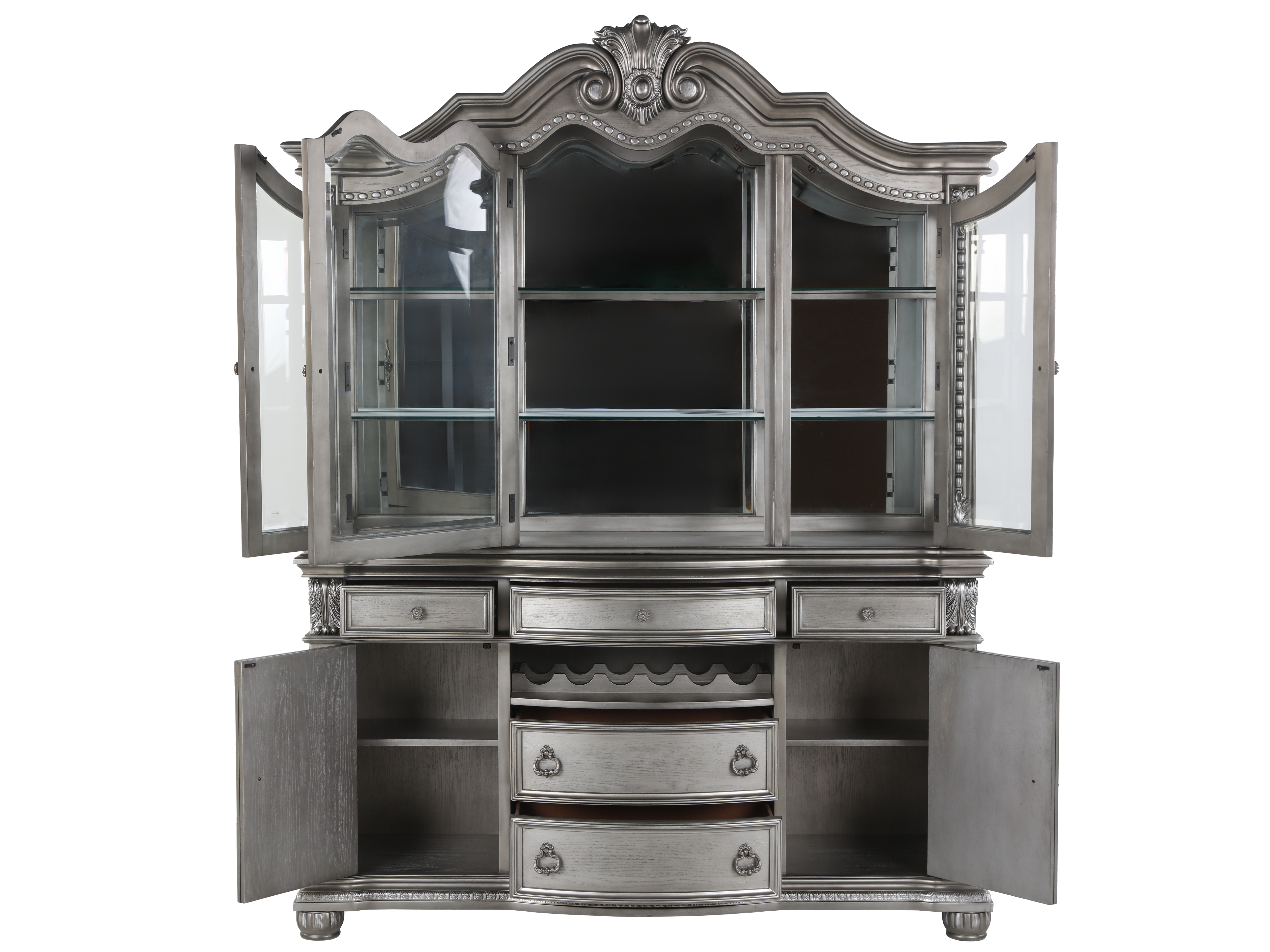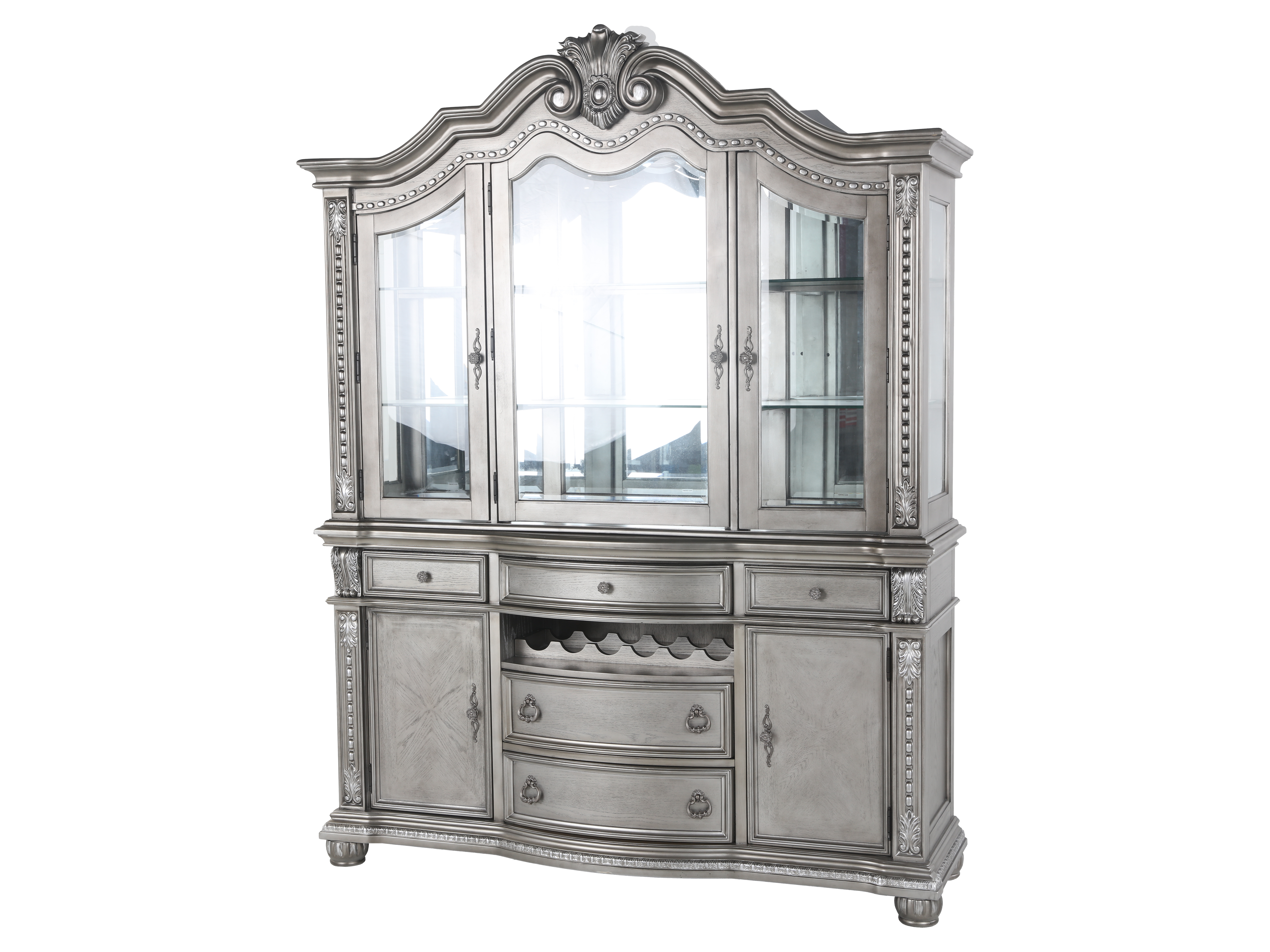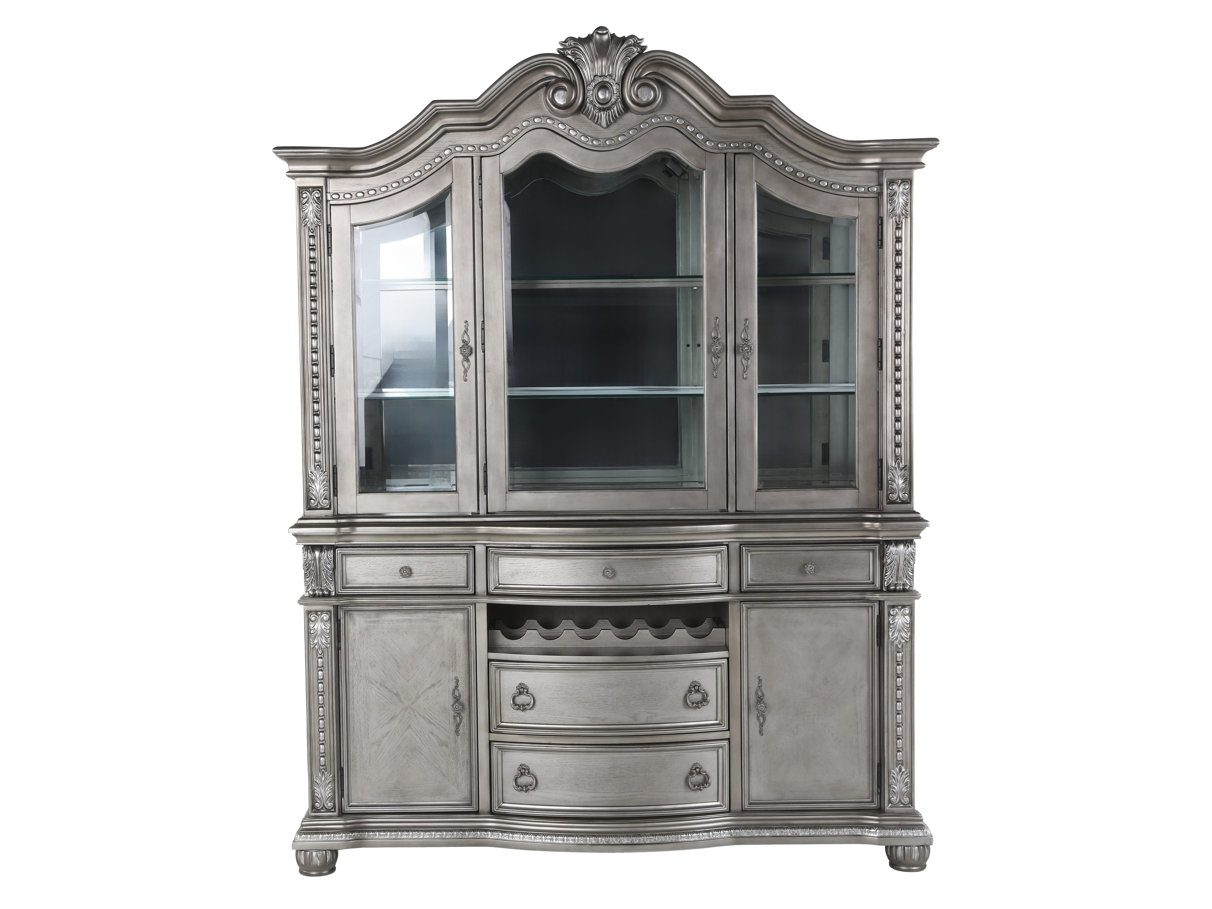 Add a touch of elegance and sophistication to your dining space with this Hutch & Buffet/ China Cabinet. Designed with intricate craftsmanship, this stunning piece features a rich silver finish with ornate detailing that exudes timeless charm.