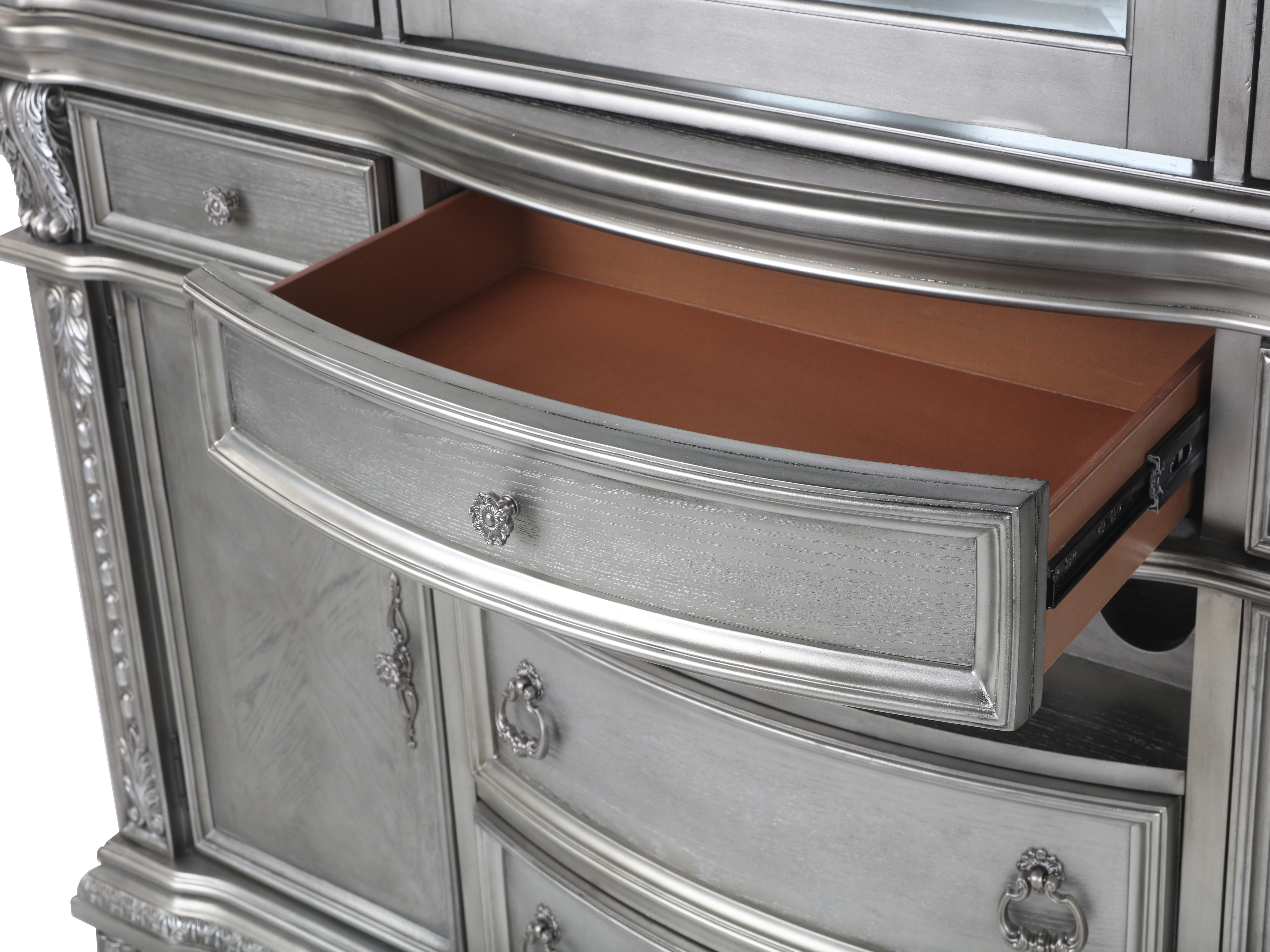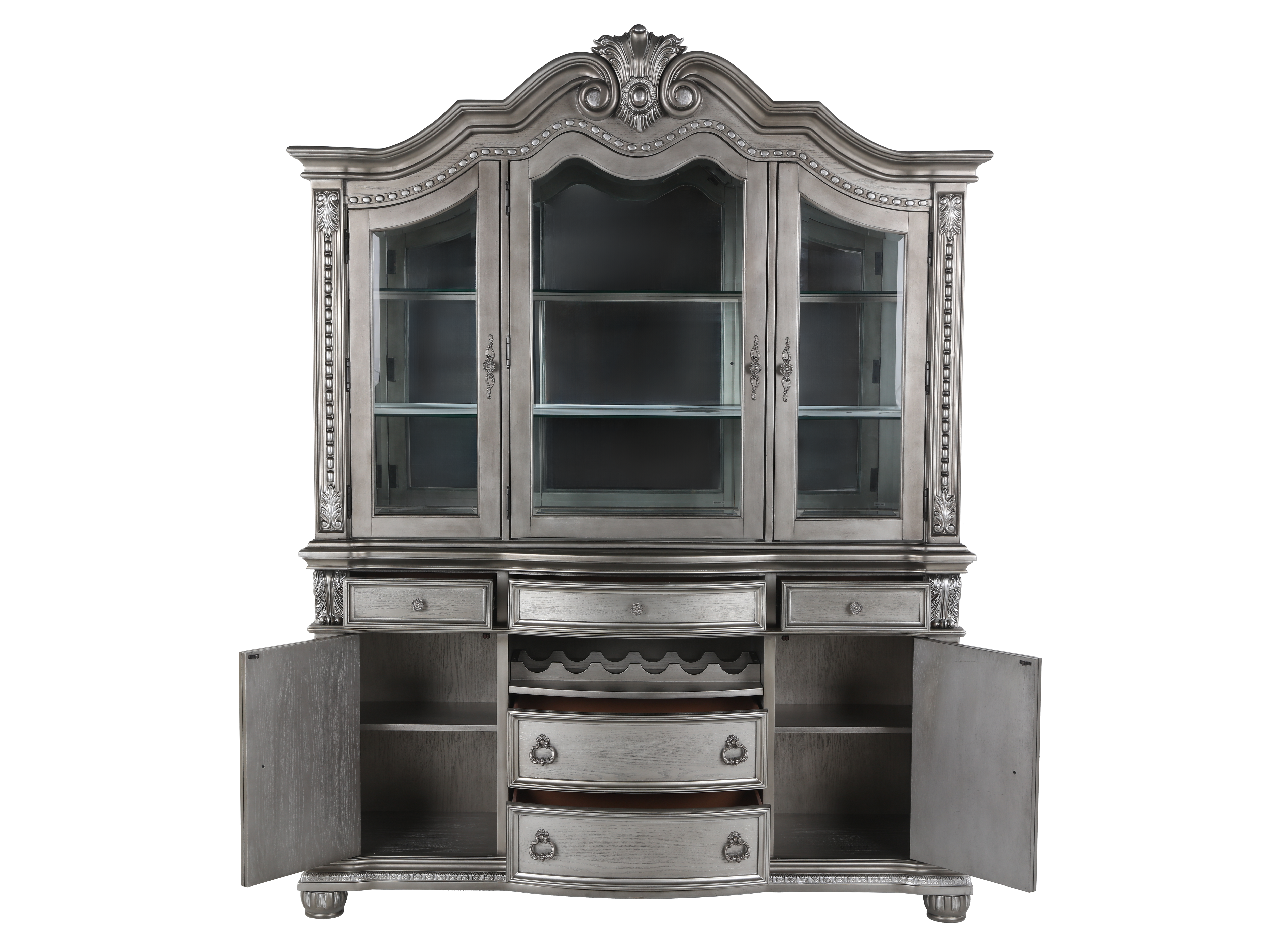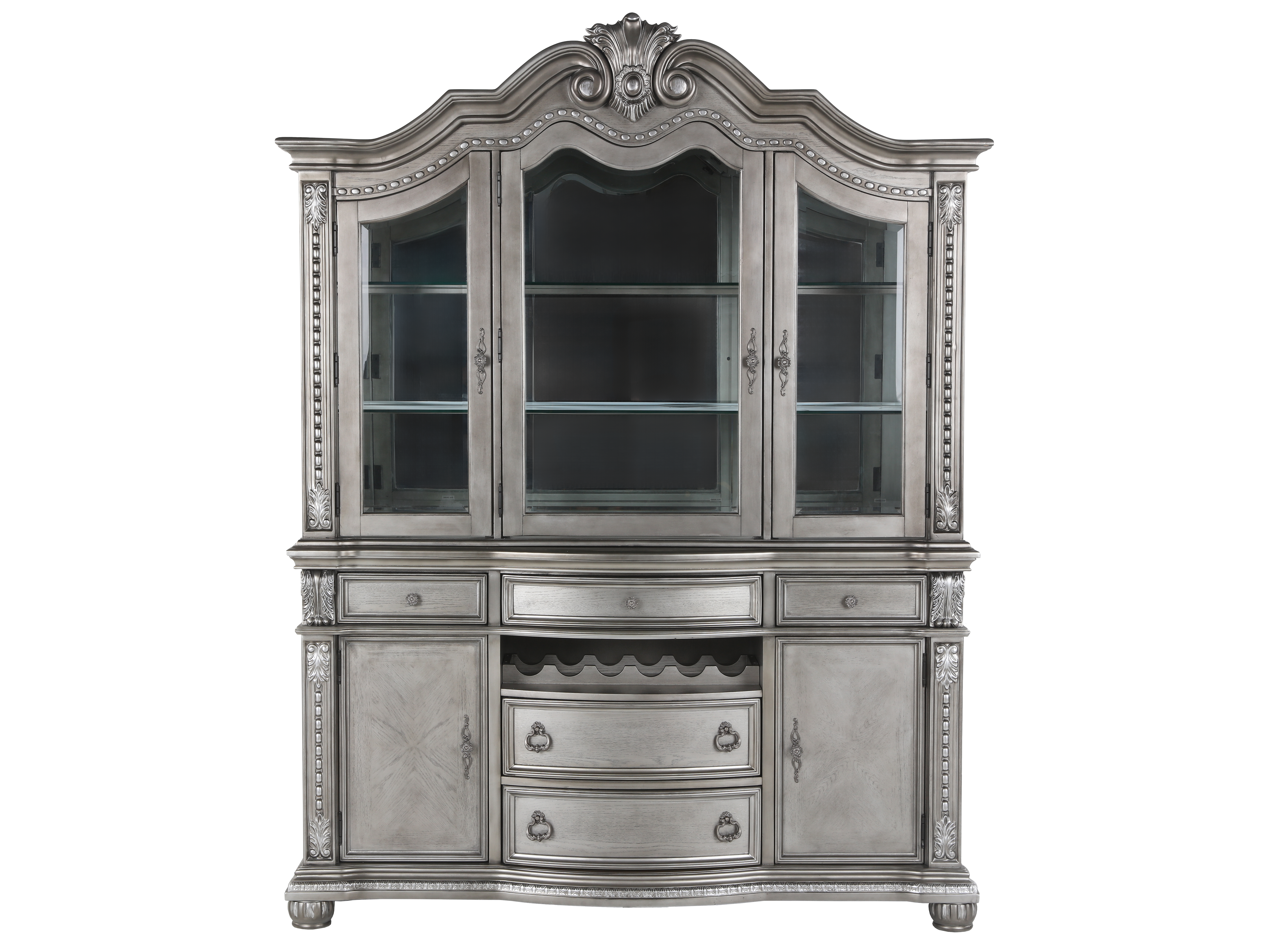 Add a touch of elegance and sophistication to your dining space with this Hutch & Buffet/ China Cabinet. Designed with intricate craftsmanship, this stunning piece features a rich silver finish with ornate detailing that exudes timeless charm.