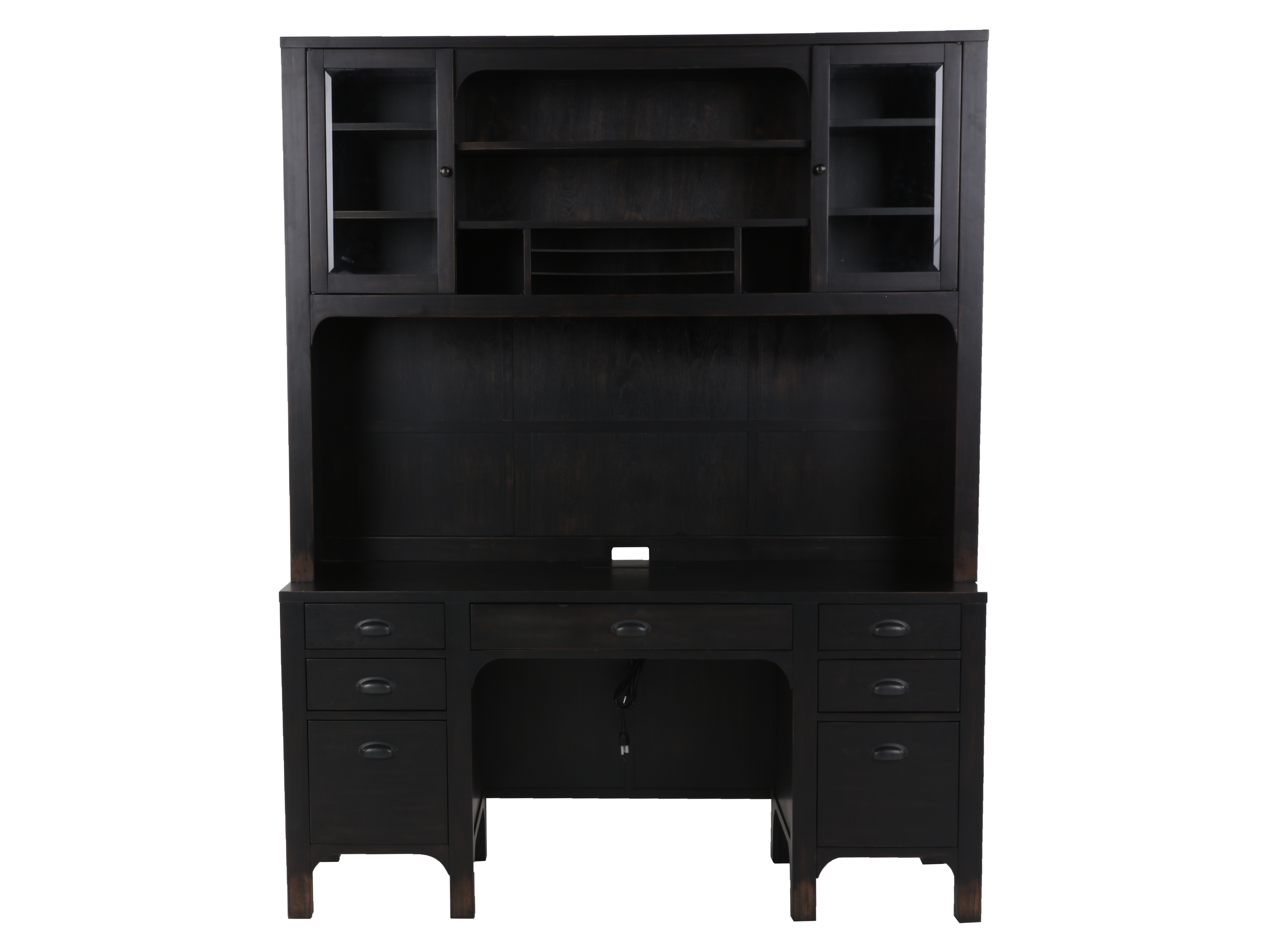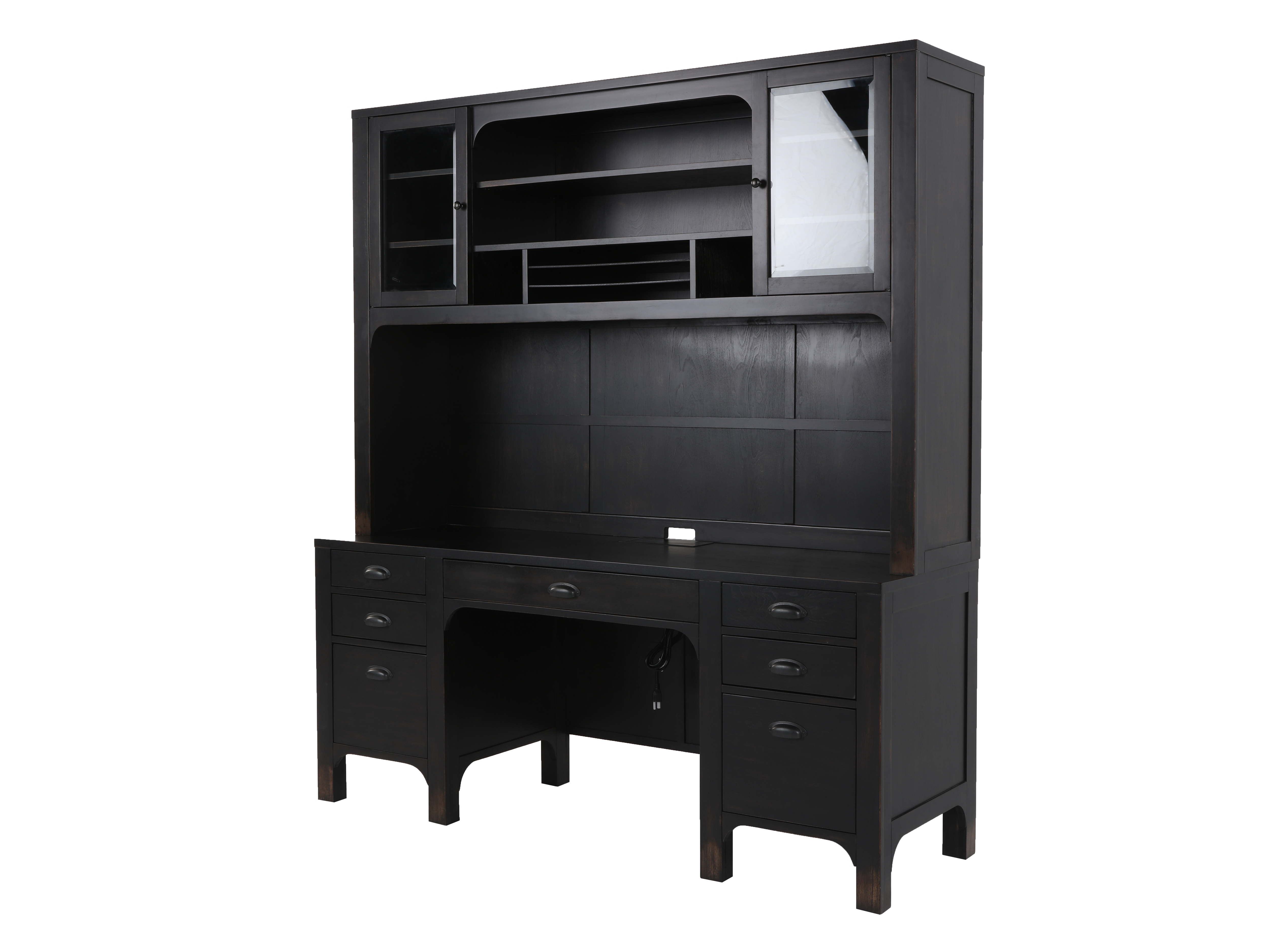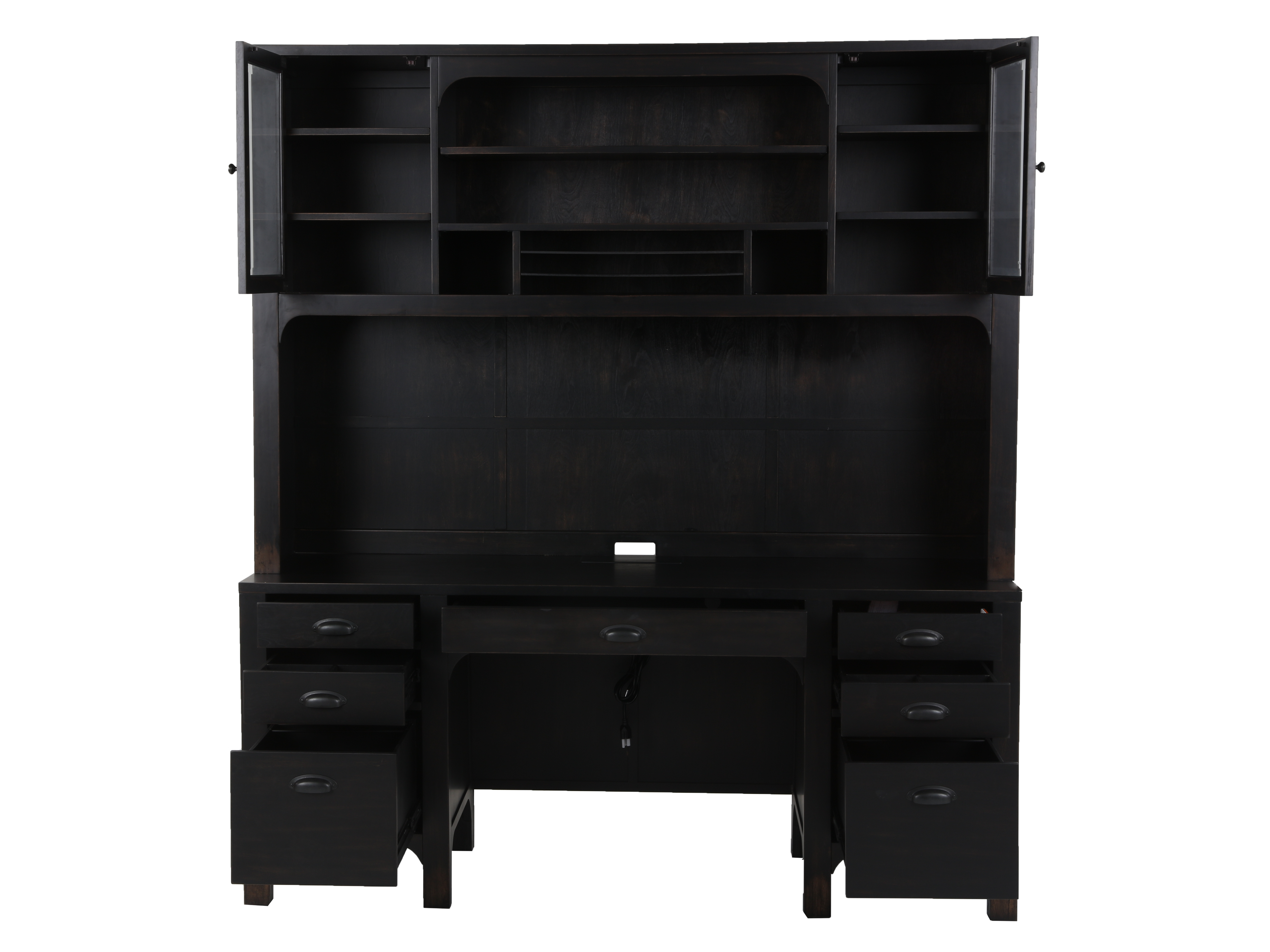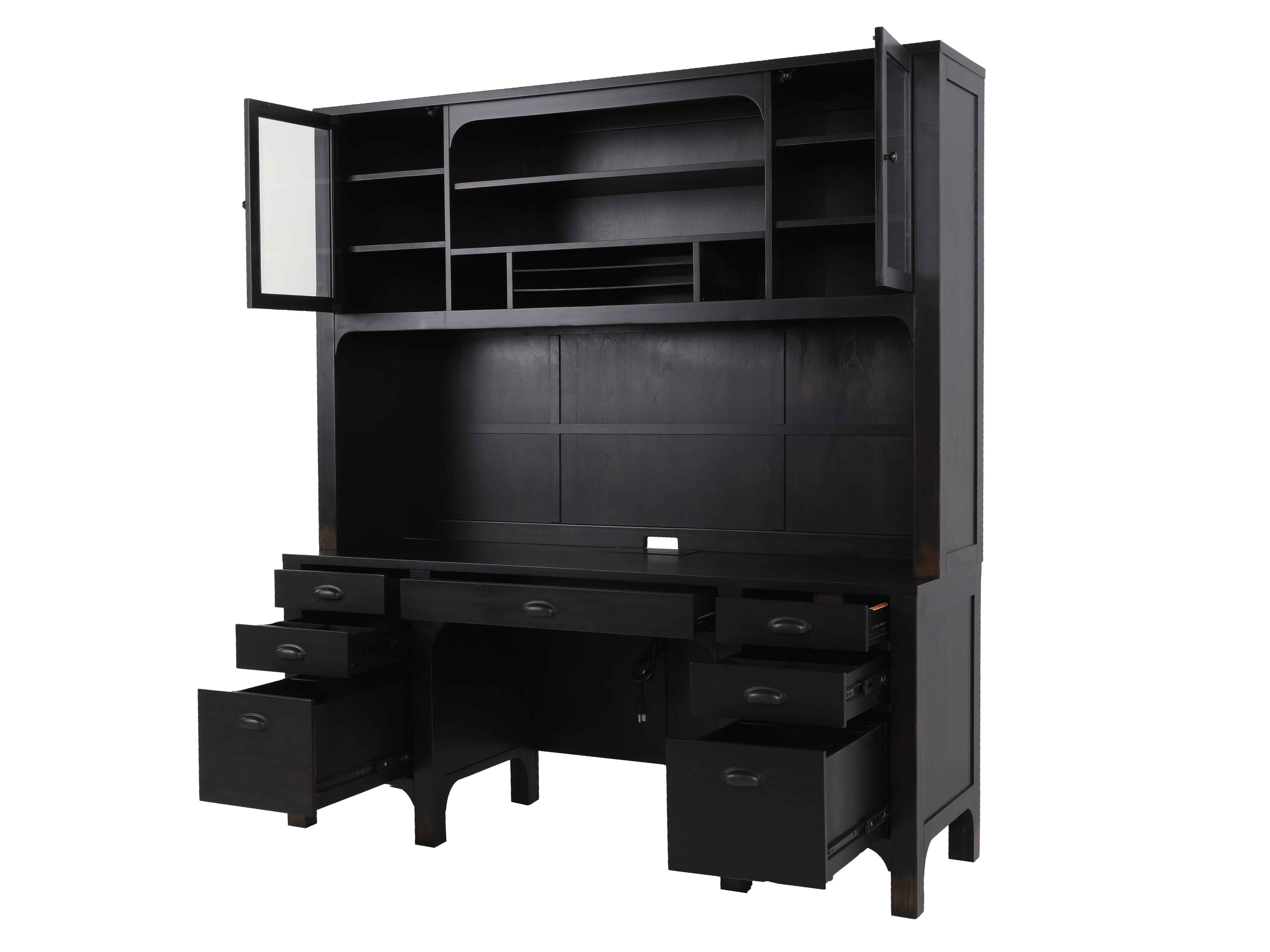 Transform your home office with our Hutch & Credenza. Made of solid and engineering wood, this sturdy and elegant duo offers ample storage. The hutch features convenient drawers while the credenza boasts spacious shelves to keep your books and office essentials organized. Elevate your space with its sleek black color.