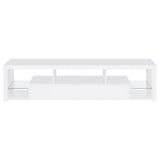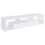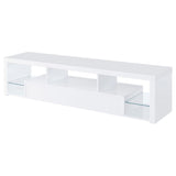 Elevate your entertainment realm with our sleek, modern TV stand. With a pristine glossy white finish and clear glass accents, it exudes elegance. Beyond looks, it's the epitome of functionality. Soft-close drawers glide effortlessly, housing your gadgets, while the glass shelves offer a stylish display. Spacious storage compartments keep your media essentials neatly organized. This stand, a harmonious blend of style and function, becomes an indispensable centerpiece for any contemporary entertainment space.