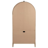 Elevate your space with this sophisticated vitrine cabinet, designed to showcase your most treasured items with style. Featuring two wood-framed tempered glass doors, the upper section offers four tiers of shelving, perfect for displaying decor, dinnerware, or collectibles. The lower section of the cabinet provides additional storage with two hand-woven cane doors and a shelf inside for hidden organization. Crafted from solid wood, engineered wood, and oak veneer, this display cabinet offers both open display and concealed storage options. Its timeless arched design and natural wood finish make it a perfect addition to dining rooms, living spaces, or home offices.