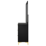Elegance meets functionality in the Dresser and Mirror set, with its modern glam design that maximizes your space while offering ample storage. The sleek dresser's boxy black frame and six spacious drawers provide a bold and organized focal point in your bedroom. Each drawer, accented with slender pull handles, contrasts beautifully with the finish, while the bracket legs echo the metallic theme. The accompanying mirror's tall, clean-lined frame enhances the setup, creating an ideal vanity space that blends seamlessly with any color palette. This set is not just a statement piece; it's a testament to sophisticated design that serves everyday needs with style.