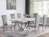 Transform your dining area into a chic space with this elegant, modern glam side chair set. Designed in a classic Parson style silhouette, these two chairs boast a tall curved back for extra comfort and support throughout long dinners. Upholstered in a plush velvet fabric across the seat, these dining chairs also feature lovely details such as button-tufted flared backs for a classic expression. Stainless steel legs in a gleaming polished finish lend a sleek modern touch. Place a set of these stunning glam dining chairs around a table for a magnificent style and comfortable seating.