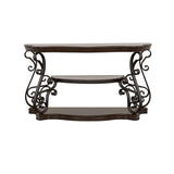 This elegant console table, also known as a sofa table, seamlessly combines style and function. Its dark merlot wood finish highlights the engineered wood and cherry veneer construction, while the ornate scrollwork on the dark bronze powder-coated metal legs enhances its timeless charm. The polished wooden middle and bottom shelves offer additional storage or display space. Perfect for accentuating hallways, living rooms, or behind sofas with classic sophistication.