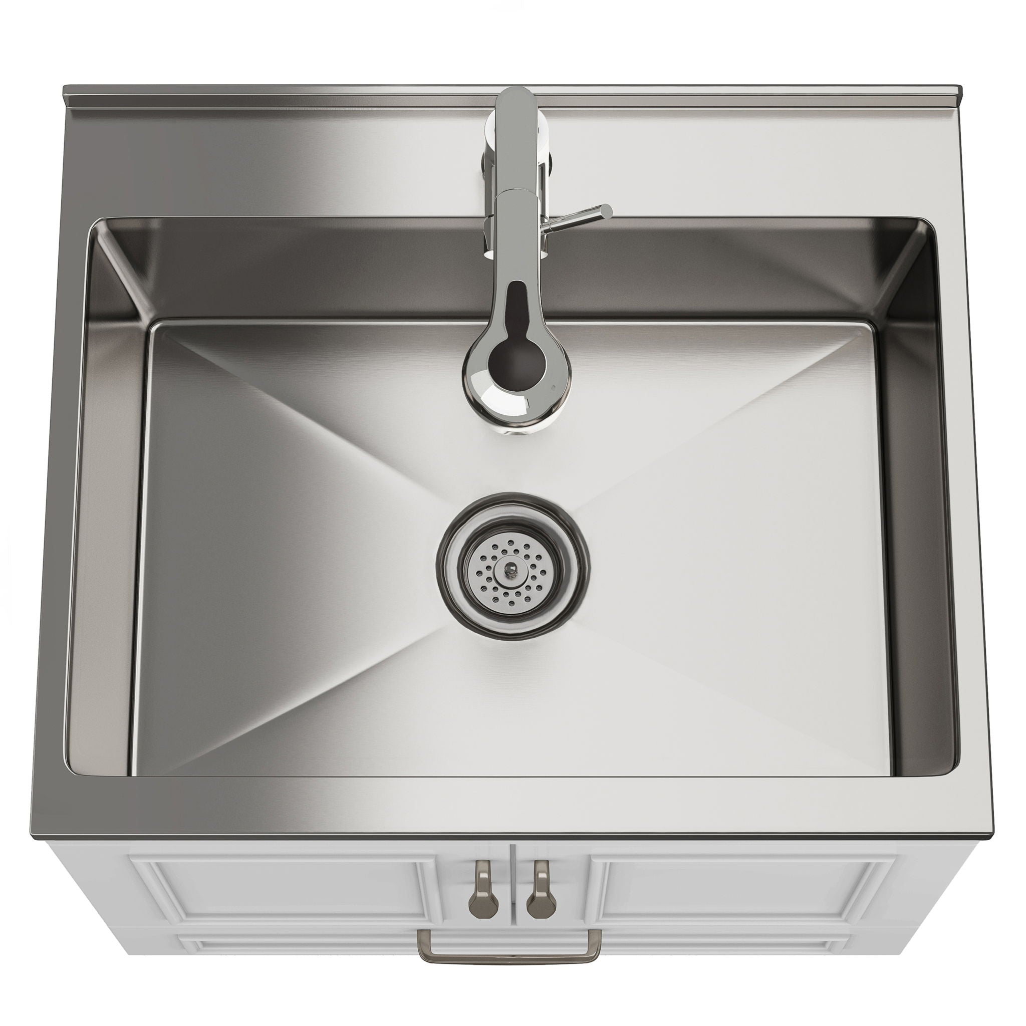 - Features two (2) paneled doors and bottom drawer with brushed nickel pulls that open to plenty of storage, Extra deep 20 gauge welded stainless steel sink