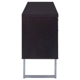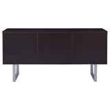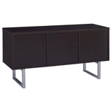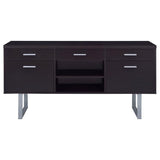 Extend the utility of an office desk with this beautiful credenza. Built with a linear silhouette, its minimalist design is flattering to a contemporary office. Cappuccino brings a dramatic finish. Metal u-shaped legs and hardware add perfect finishing touches. Storage and utility are top-notch with a top drawer, an open shelved compartment. and two file drawers.