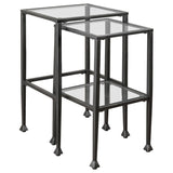 This two-piece nesting table set features sleek, modern design with clear tempered glass tops and shelves. The black powder-coated metal frame ensures durability and stability while enhancing the contemporary look of your living space. Perfect for compact areas, these tables can be conveniently nested when not in use and easily separated for versatile placement. Whether used as accent tables or side tables, their clean lines and minimalist design make them a practical and stylish addition to any home.