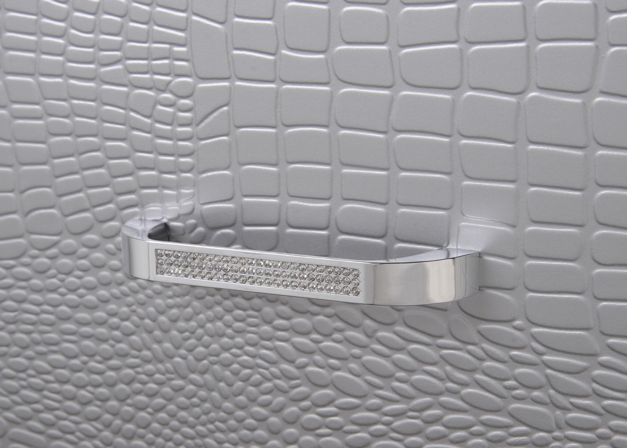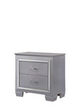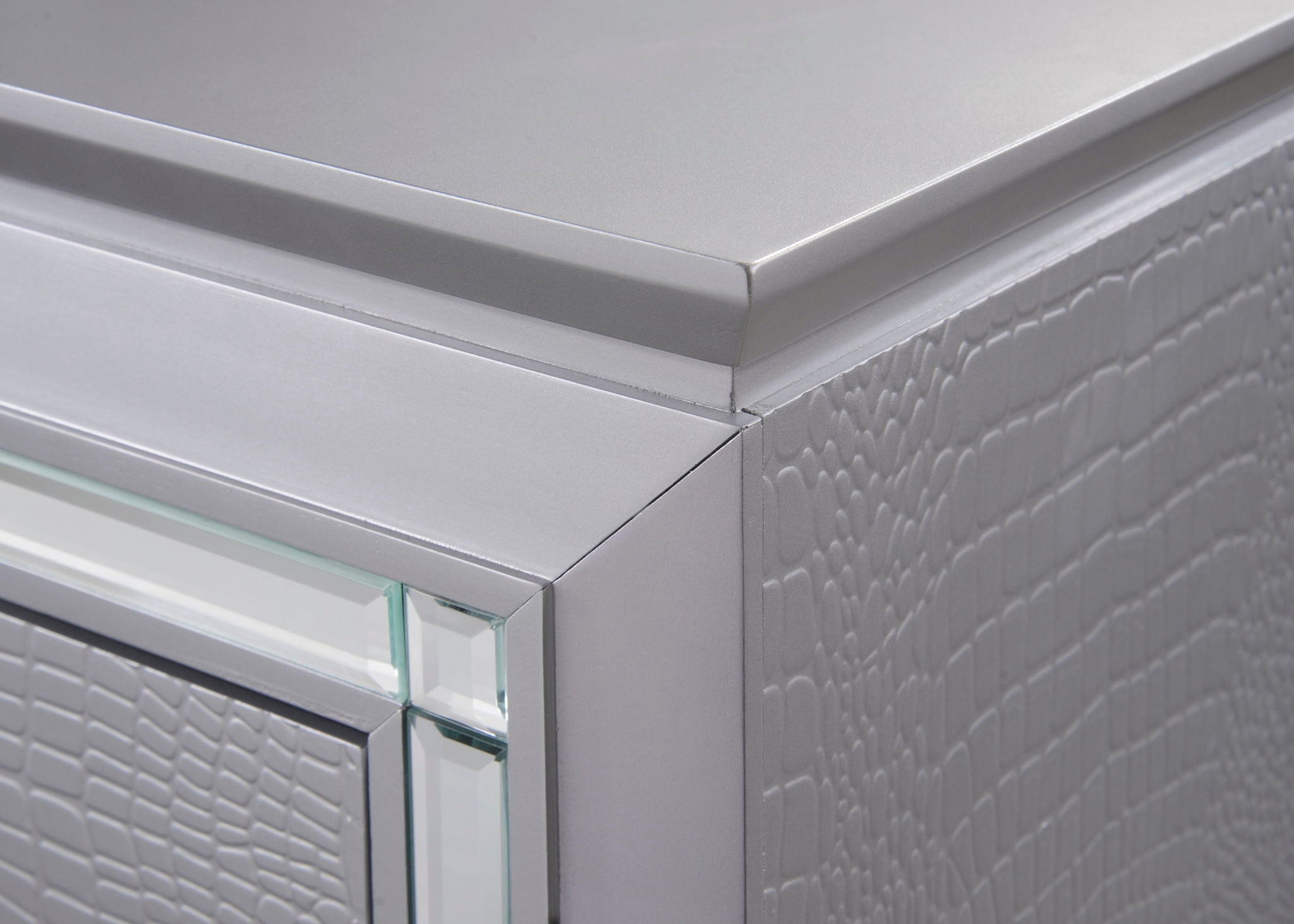 This bedroom collection offers a touch of glamour and luxury to any home. The chic finish paired with elegant textured panels creates a sophisticated look that can elevate any bedroom decor. The bed is a statement piece, featuring a stunning tufted headboard with integrated LED lighting that adds a classic touch to the modern design. Accompanying the bed is a selection of matching furniture pieces, including a dresser with a mirror, a tall chest, and nightstands, all finished in the same lustrous silver tone.