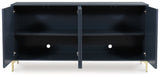 Elevate your aesthetic with the chic design of this accent cabinet. Sleek goldtone legs and striking doors with a geometric pattern infuse contemporary flair wherever you place this piece. Add a dark blue finish, and you've got a stunning showstopper. Providing function to form, the cabinet's push magnetic doors reveal two shelves and openings for electronics.