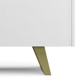 - Features two (2) Doors with discreet hand pulls, open central area with adjustable shelving and solid metal angled legs in a gold finish for reliable support