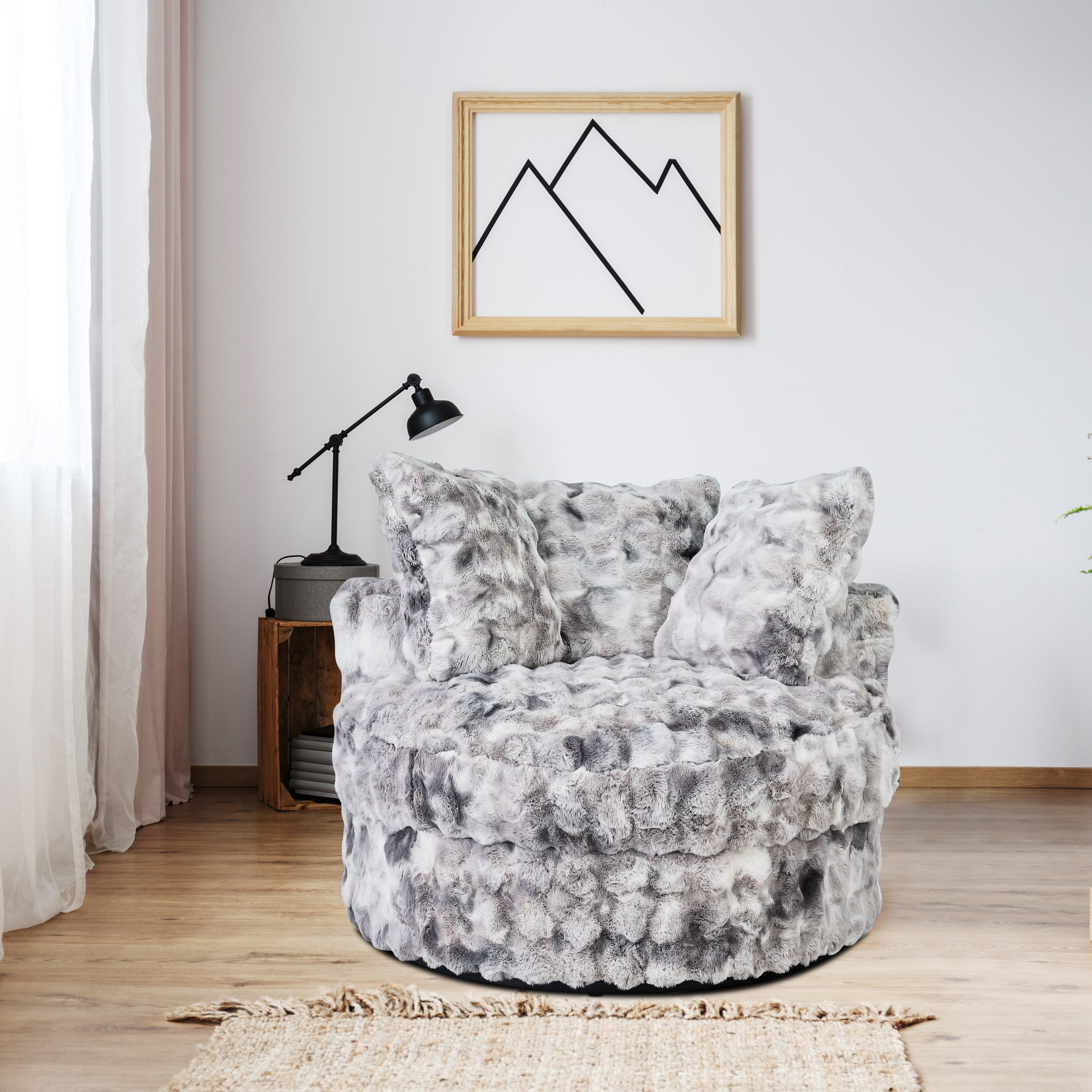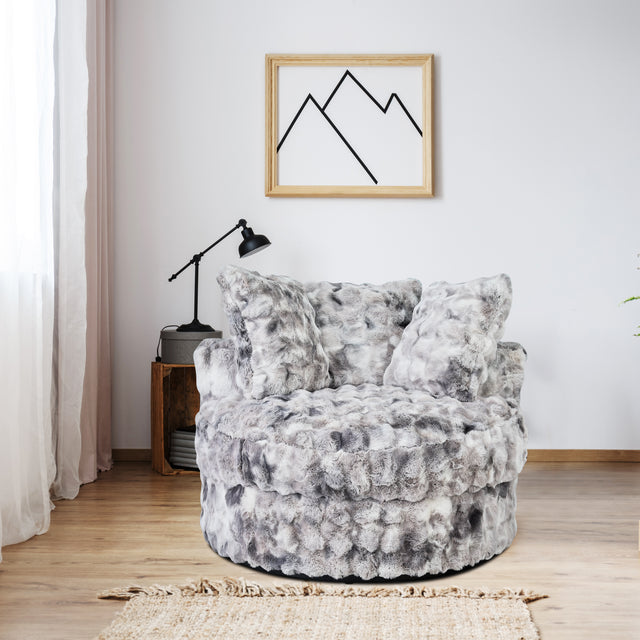 Experience ultimate comfort and style for you and loved ones with our Luxurious Faux Fur Round Swivel Chair. Wrapped in luxurious, soft-touch faux fur, this spacious chair boasts an ideal reading, lounging, and recline location. Its spacious round design and included matching pillows deliver ultimate comfort, and its reinforced swivel base makes effortless turns easy. Perfect for living rooms, bedrooms, and reading alcoves, this fashionable and comfortable piece defines any modern room.
