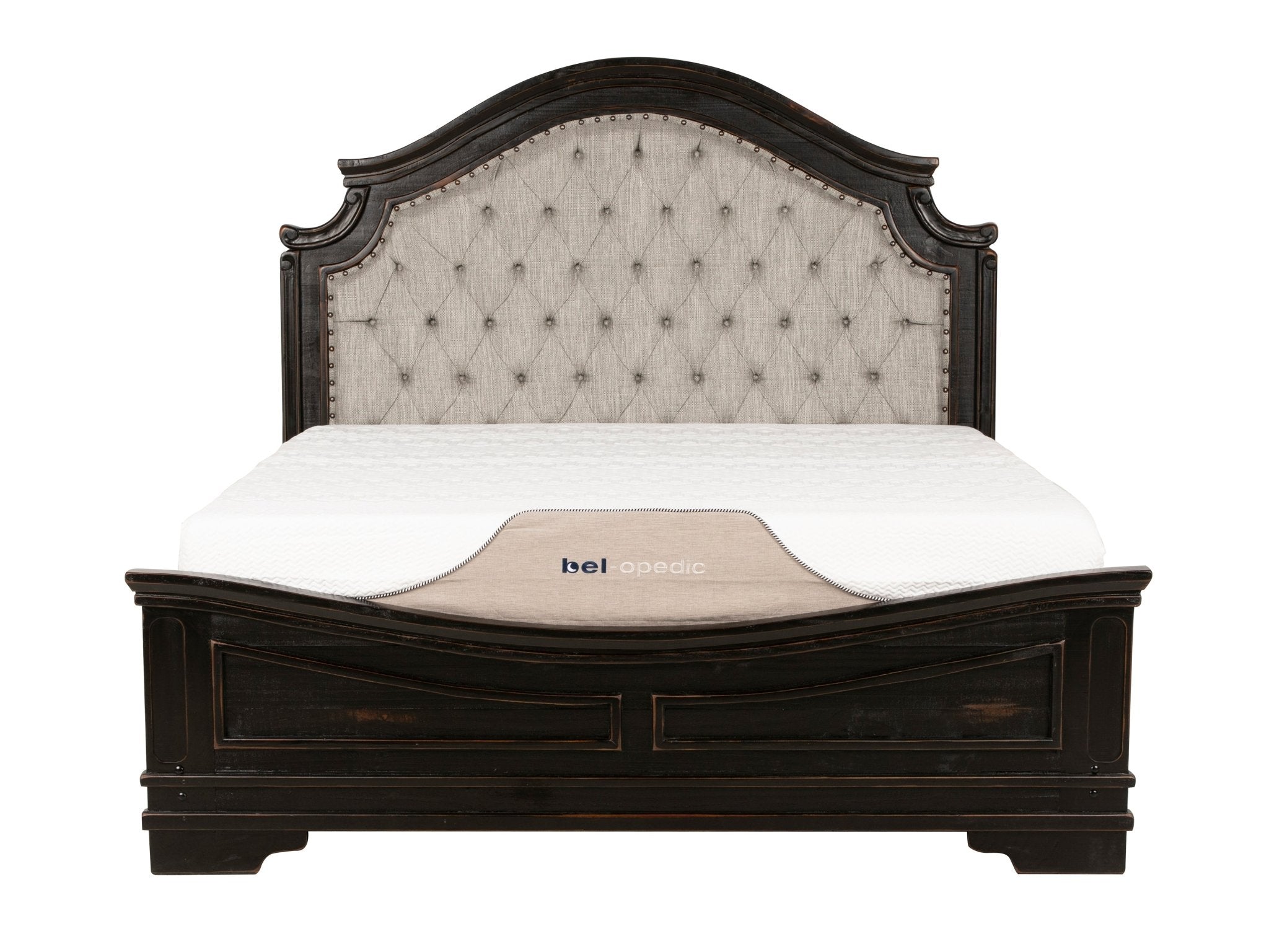 A rich dark cherry finish with classic moldings and an upholstered, diamond-tufted headboard edged in nailhead trim for an elegant, traditional look.