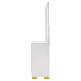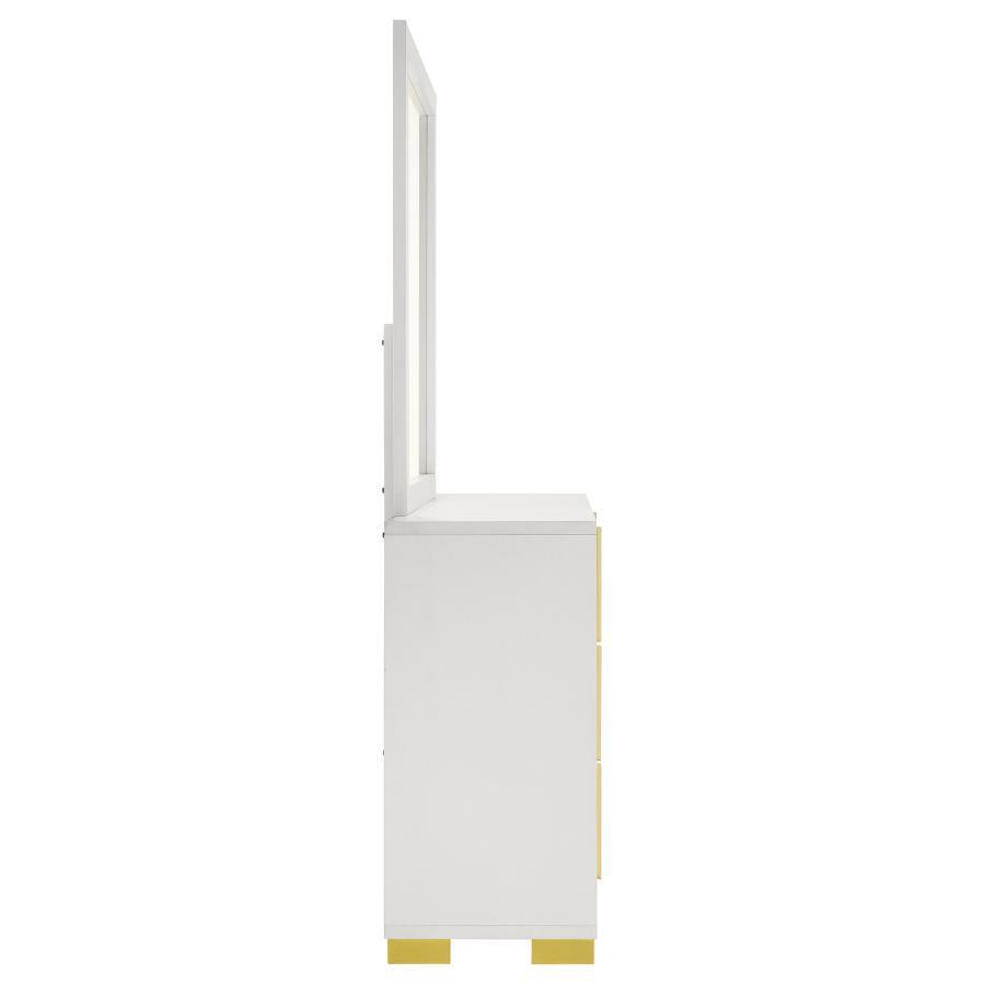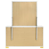 Immerse yourself in the striking elegance of the this dresser and mirror set, a true embodiment of contemporary chic with an Art Deco twist. The six-drawer dresser, crafted with wood products, showcases a captivating vertical design, with metal accents creating a mesmerizing geometric pattern. The drawers, featuring English dovetail construction, glide smoothly on center metal runners, marrying form with function. Above, the sleek, minimalist mirror, framed in engineered wood and decorative laminate, complements the dresser, its non-beveled glass amplifying the room's space and light. Together, this set offers a harmonious balance of dramatic aesthetic and practical elegance, transforming the bedroom into a modern-day sanctuary.