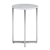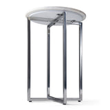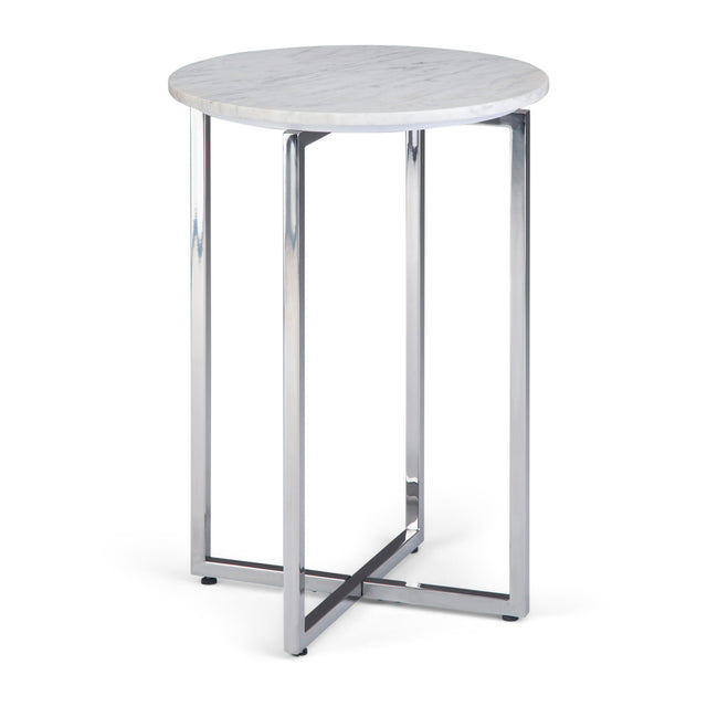- Featues a round marble table top complemented by an X shaped stainless steel base