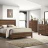 This bedroom set offers a minimalist design with a nod to rustic aesthetics, perfect for creating a serene and uncluttered space. The straightforward lines of the bed frame, combined with the rich wood finish, exude a sense of calm and earthiness. The accompanying pieces, including a simple dresser with a matching mirror, a functional chest, and a streamlined nightstand, are all characterized by their clean profiles and understated hardware. This collection is designed for practicality and durability, with ample storage options that cater to a hassle-free, organized lifestyle.