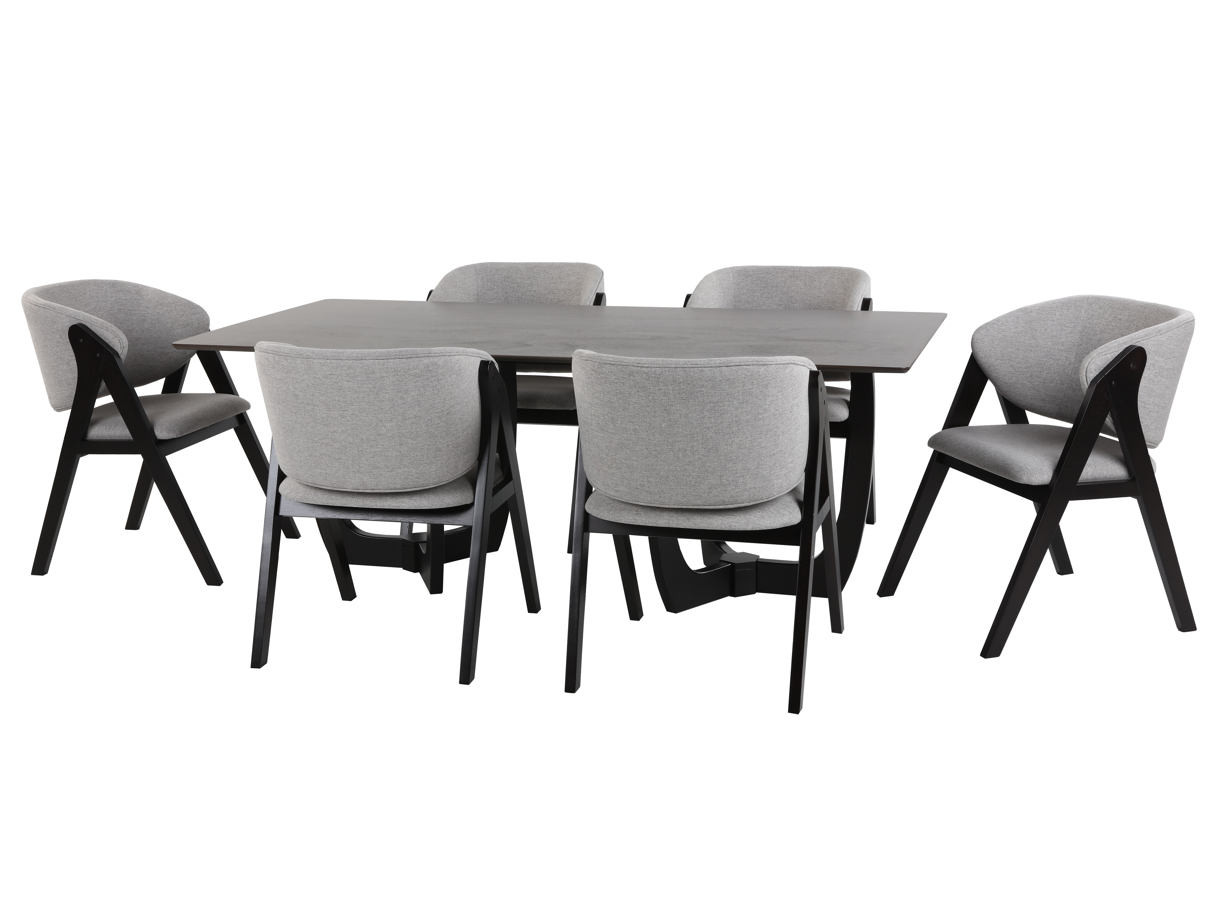 • Comfortable Chairs: The set includes six chairs with padded seats and backrests. Upholstered in a soft, light gray fabric, they provide unmatched comfort. The angular wooden frames add to the stability and complement the table’s modern aesthetic.