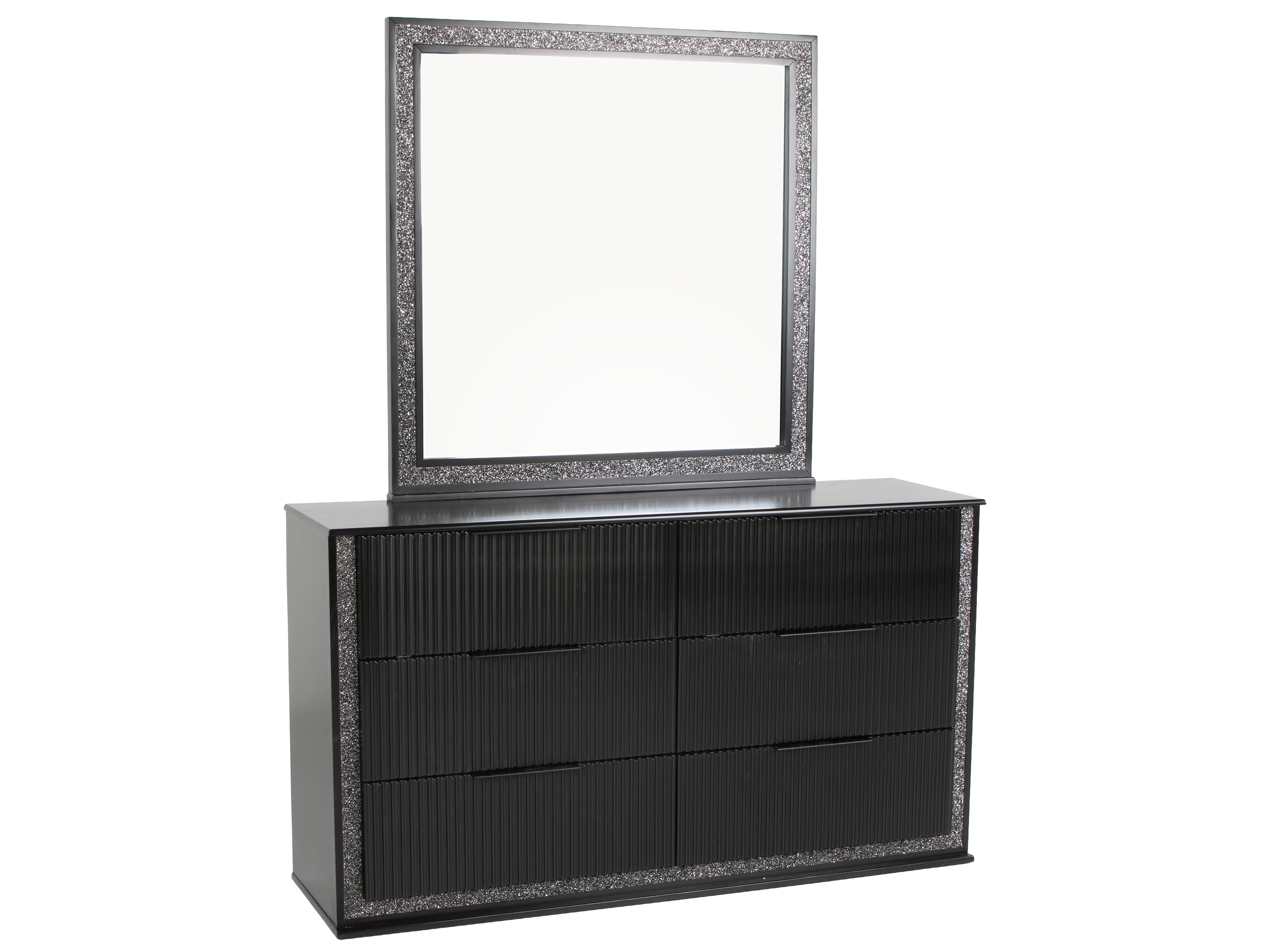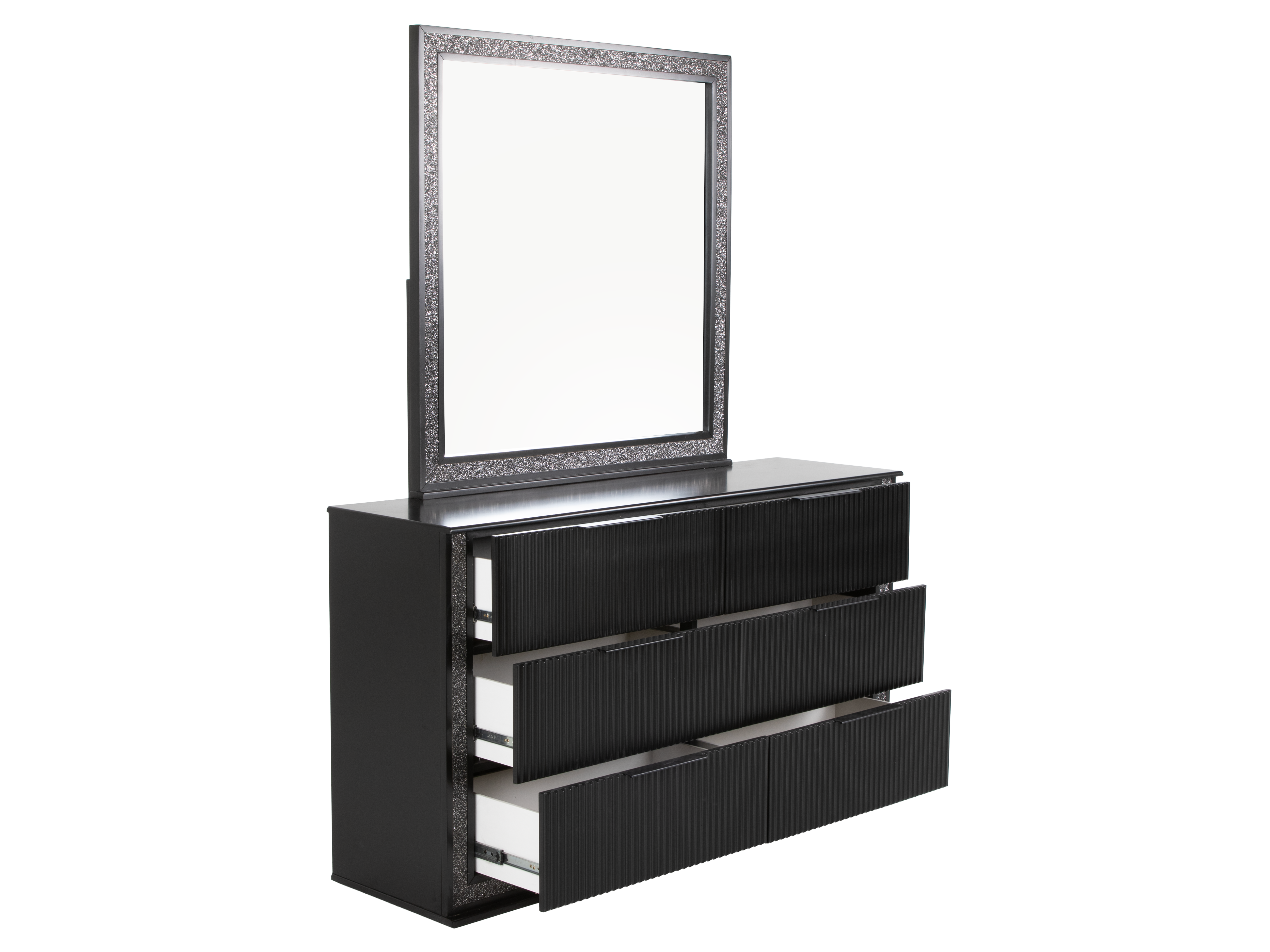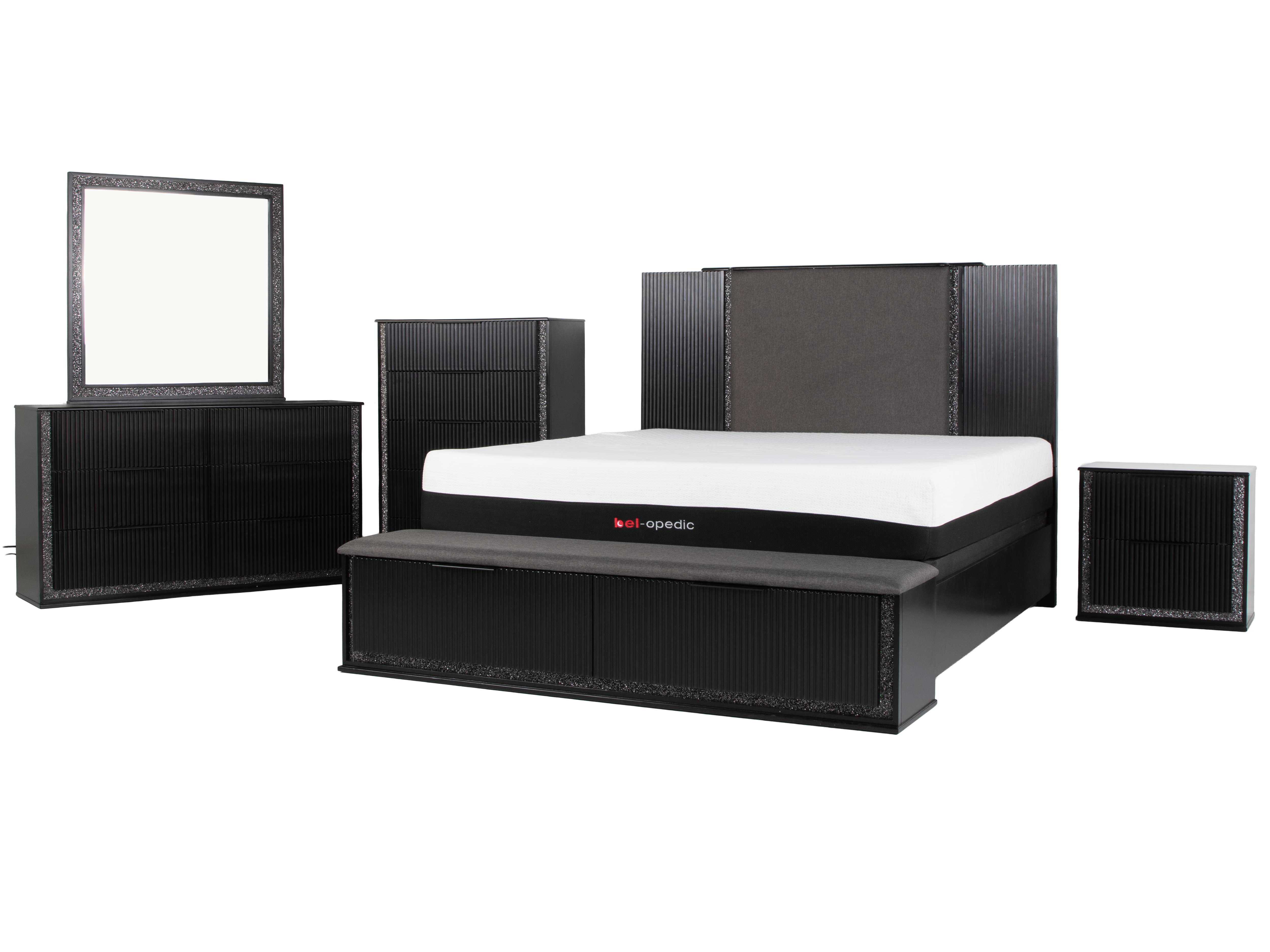 This set includes the bed (king or queen), a nightstand, a dresser, and a mirror. The chest is sold separately.