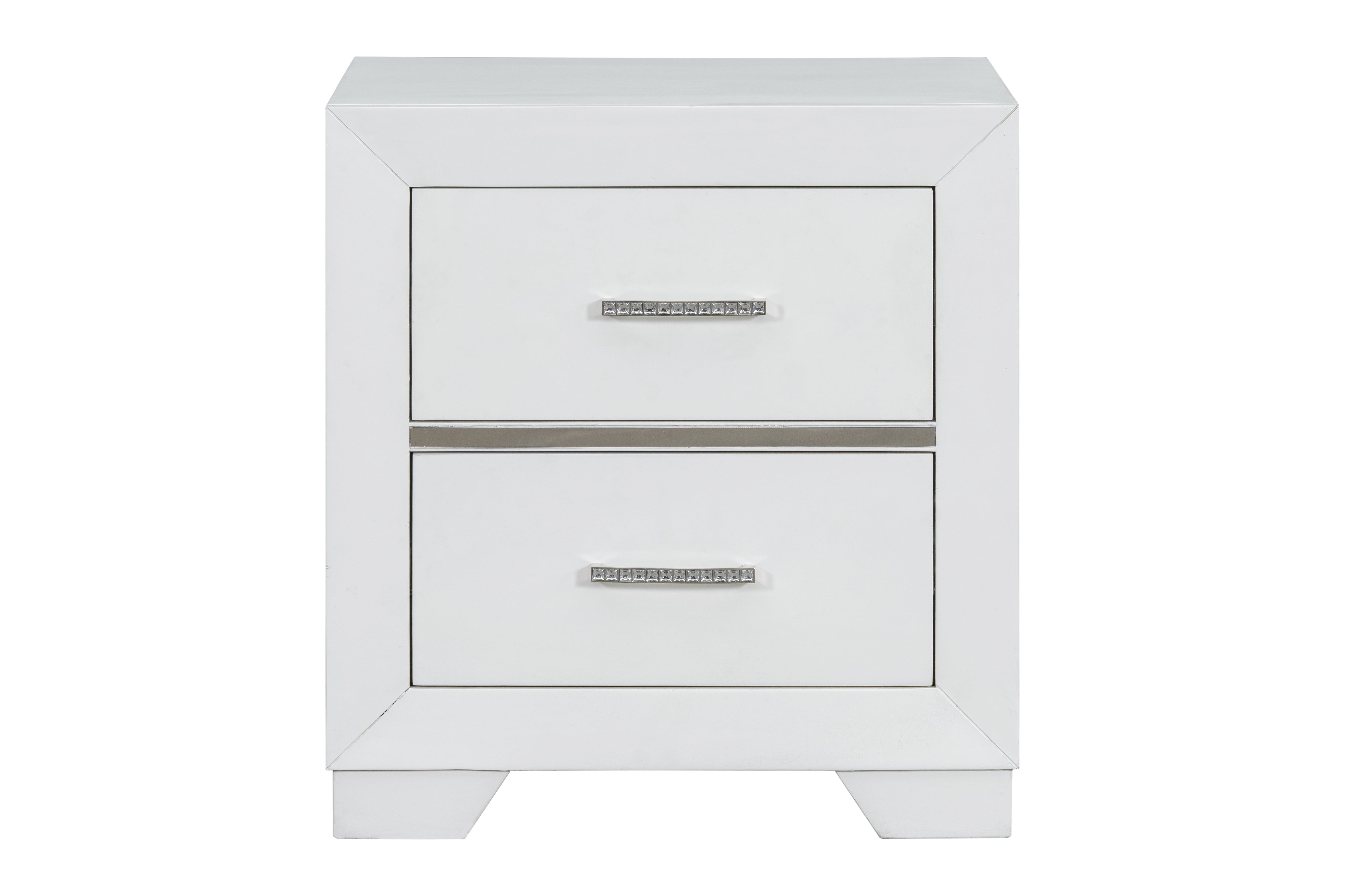 Sleek and functional, this modern white nightstand is the perfect bedside companion. Featuring two roomy drawers and a clean-lined profile, it offers practical storage without sacrificing style. Crystal-like accented handles and a smooth white finish complement contemporary interiors.