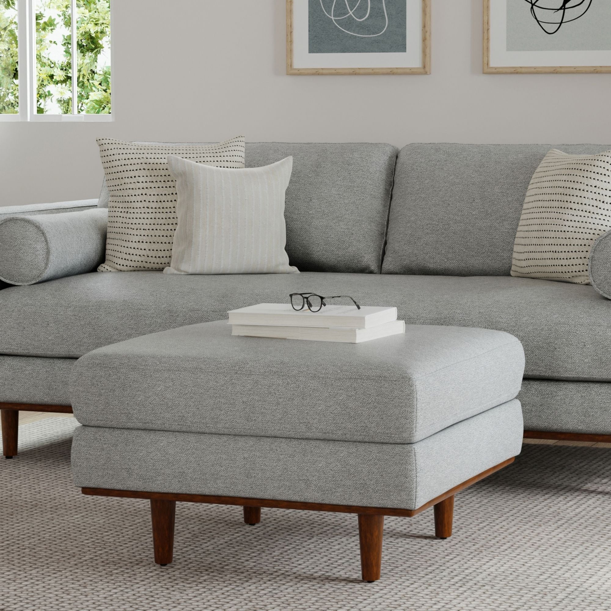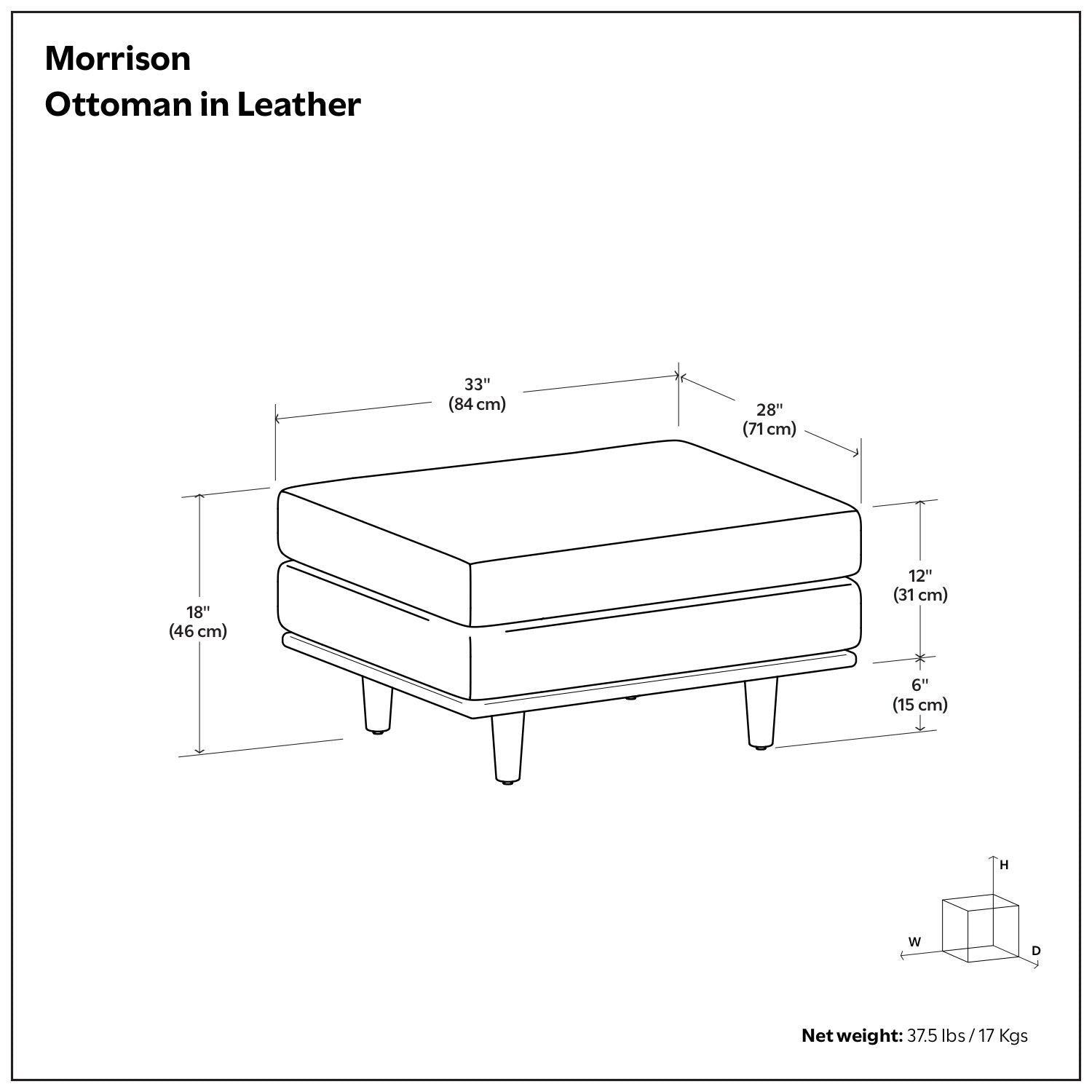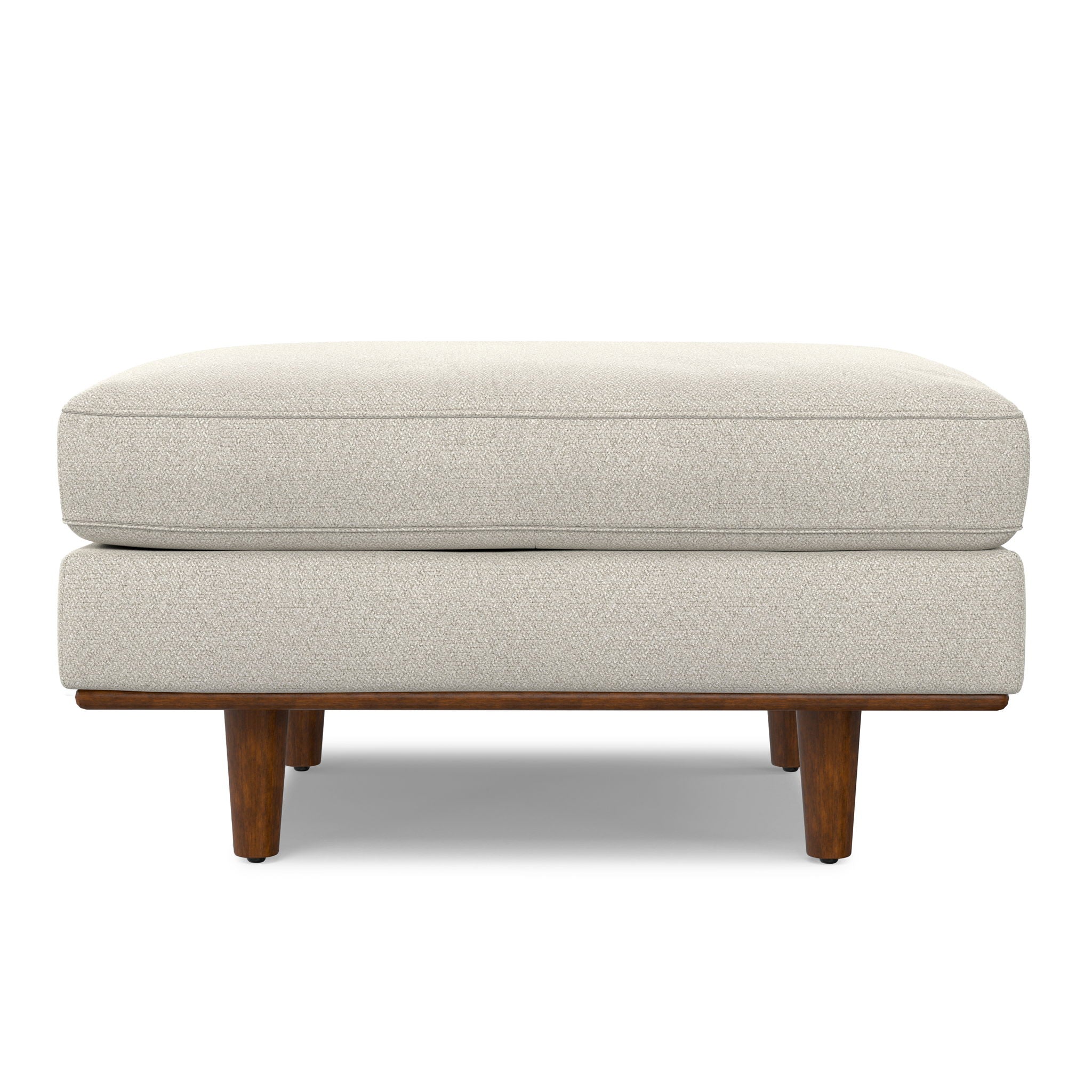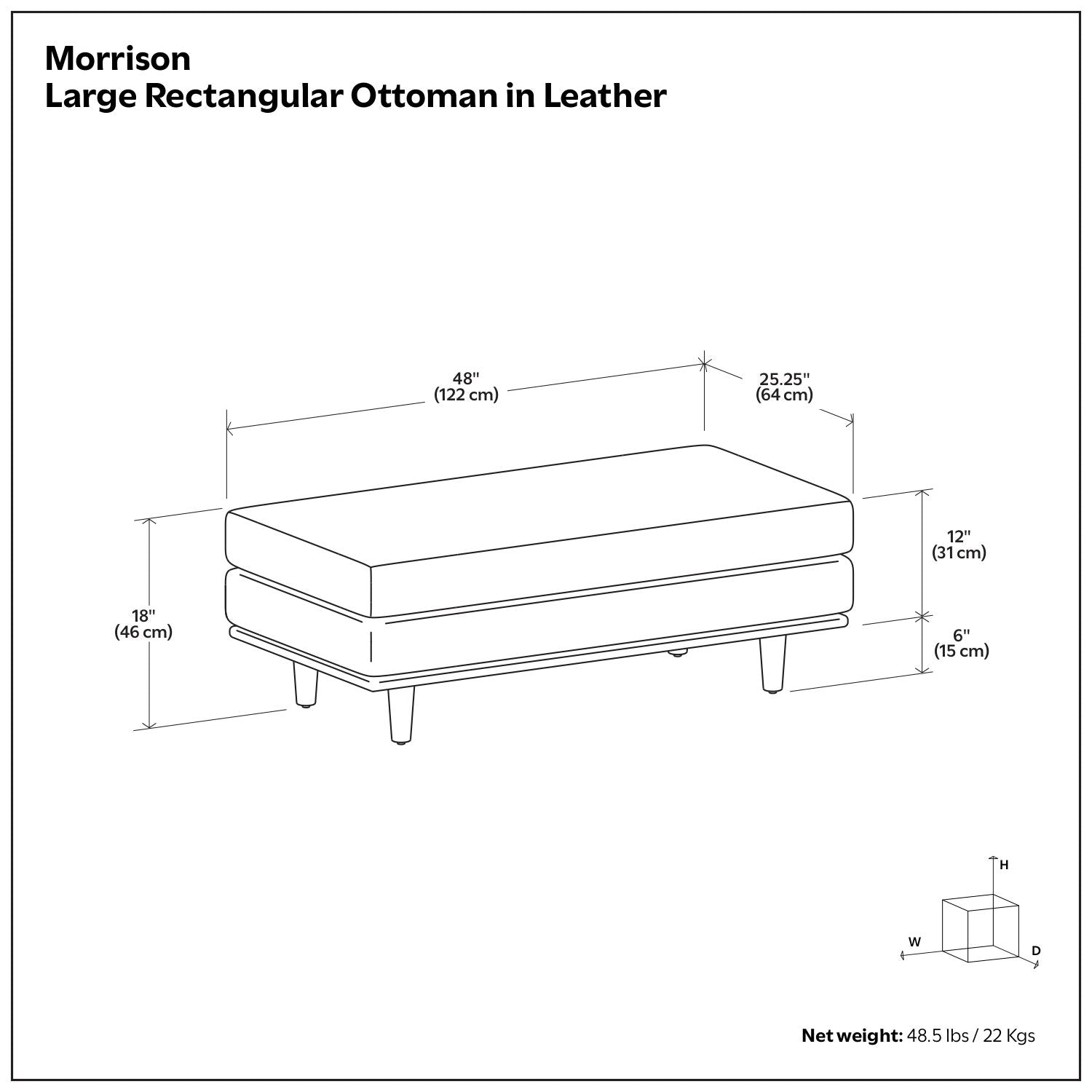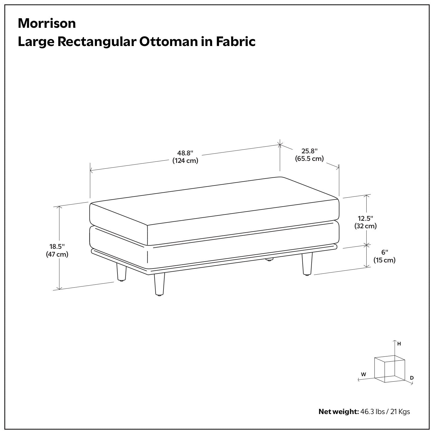 - Handcrafted, multifunctional ottoman with mid-century modern styling can be used as a footrest and impromptu coffee table, or place it against one of the matching Morrison couches to convert the sofa into a flexible sectional; accommodates up to 300 lbs.