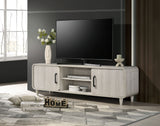 Elevate your living space with this sleek and contemporary entertainment solution that blends modern design with functionality. Featuring a streamlined silhouette and a chic, light wood finish, this piece exudes understated elegance while offering practical storage options. Sliding doors let you alternate between closed cabinets and open shelving, perfect for displaying décor or housing media devices. Enhanced with minimalistic black handles for a touch of contrast, this unit stands on tapered legs, adding a mid-century flair to its aesthetic. Whether you're setting up your home theater or showcasing your favorite accents, this centerpiece effortlessly combines style and utility to create a harmonious and inviting ambiance.