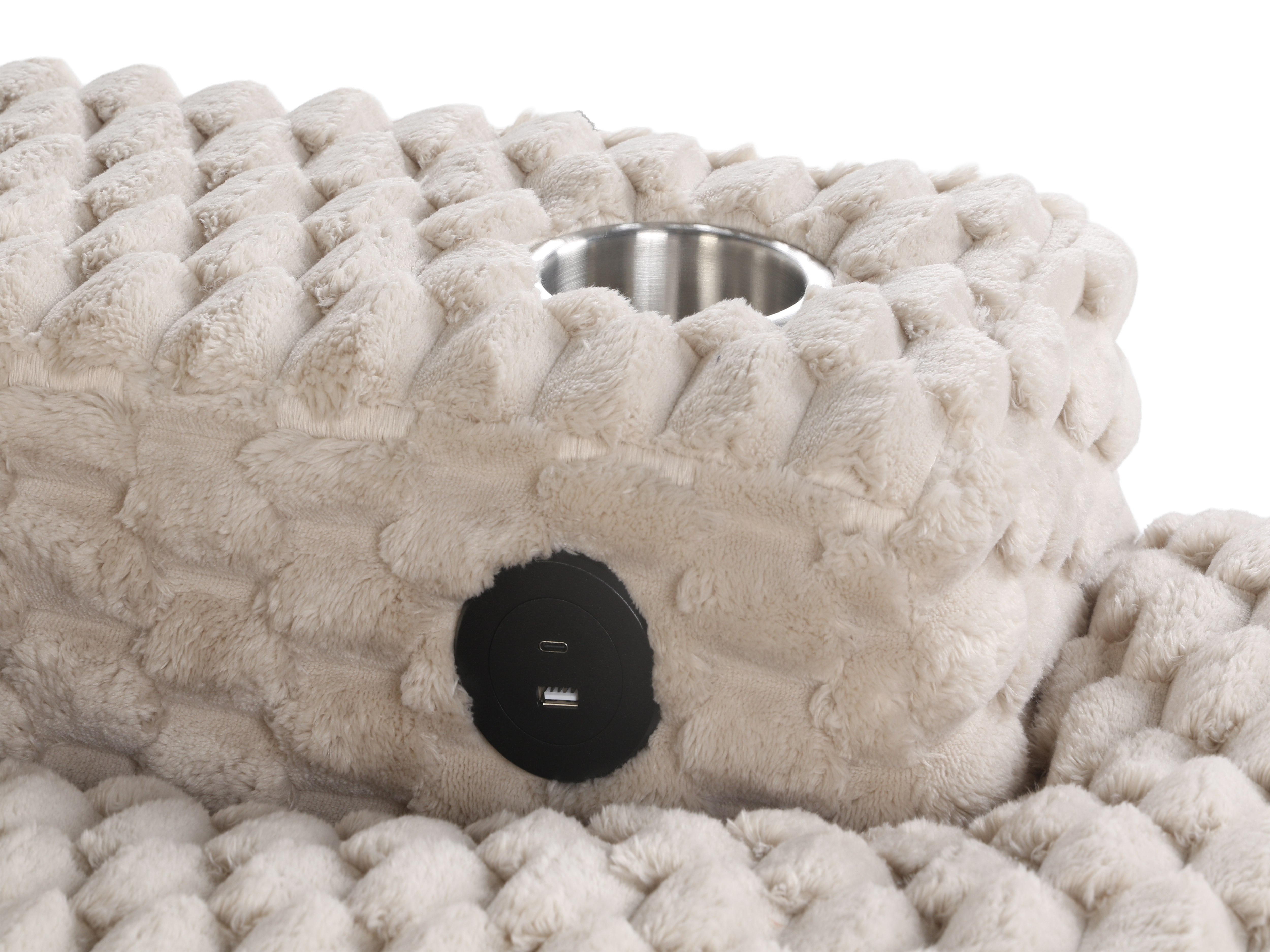 Designed with comfort and convenience in mind, it features built-in cup holders on the armrests to keep your drinks close at hand, and dual USB charging ports discreetly integrated inside the armrest—so you can relax without worrying about battery life.