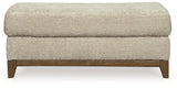 Serene style with a modern sensibility. Delight in the cozy, versatile embrace of this ottoman. It takes an on-trend approach to irresistible texture and natural beauty, showcasing soft upholstery accented with a transitional wood trim. As refined as it is laid back, the ottoman also keeps comfort a priority with a plush, thick cushion.
