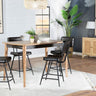 With a hint of ranch inspiration, the design of this counter height dining set is a brilliant choice for an easy, casual living space. Indulge in a calm vibe with a set anchored by a natural finish sheesham table featuring a spacious rectangular top and tapered, rounded legs. A dark apron with geometric design detail adds an exotic effect. Mid-Century Modern influence adds to four comfortable counter stools with scoop seats and a thick back, both with horizontally channeled leather upholstery. Metal framing features iconic retro slender rounded, splayed legs.