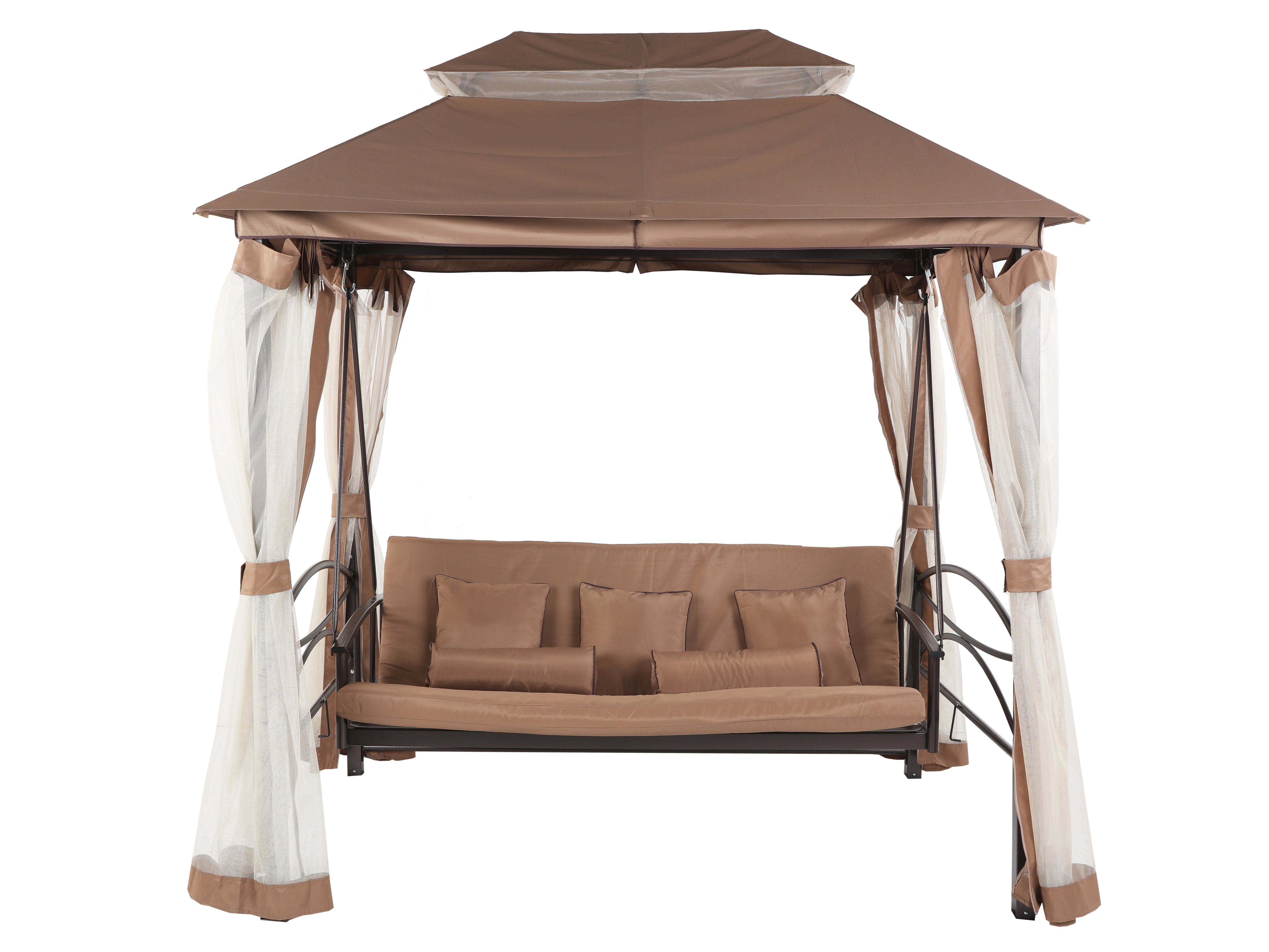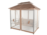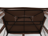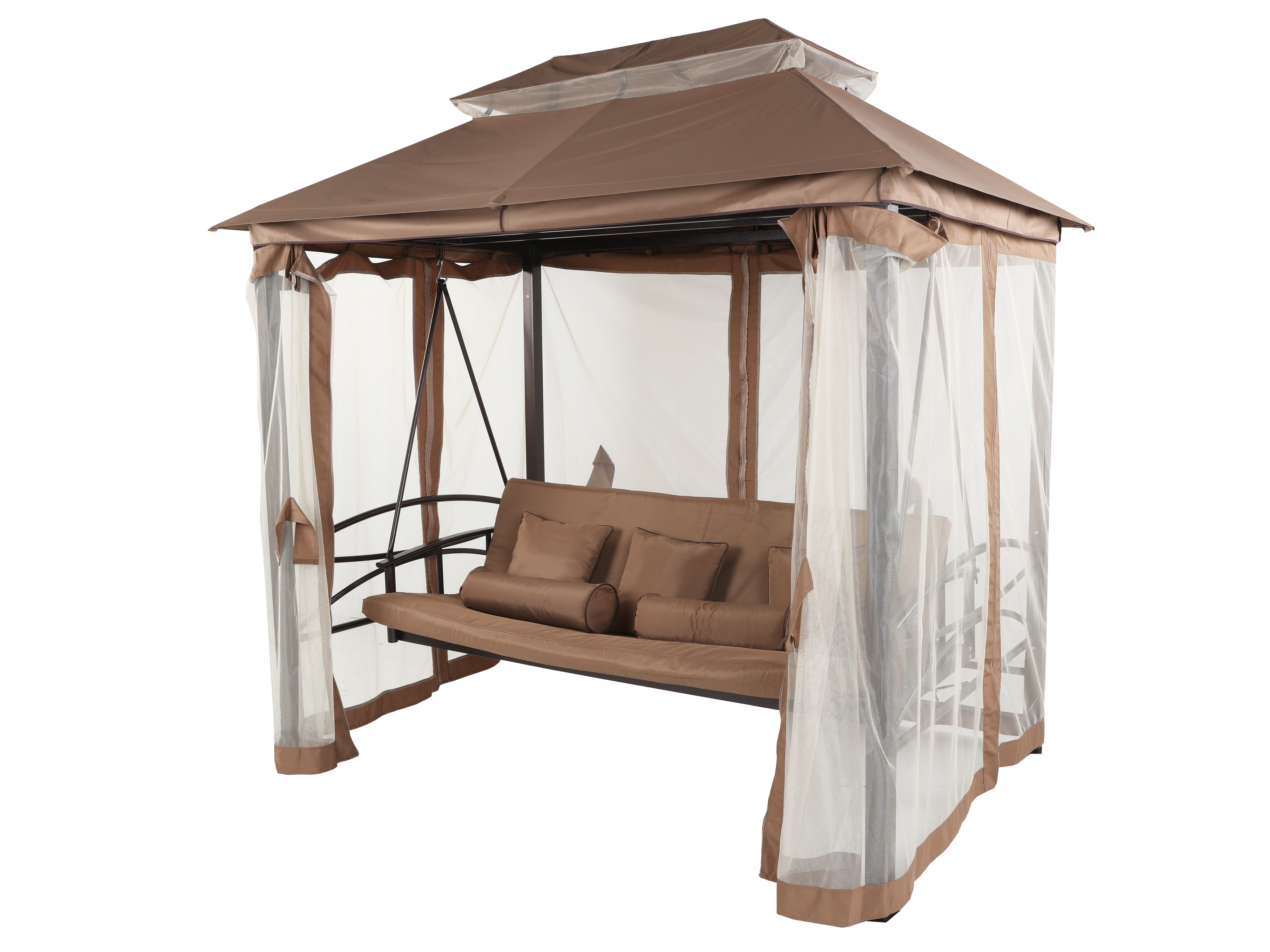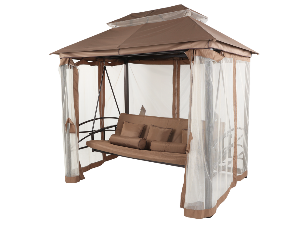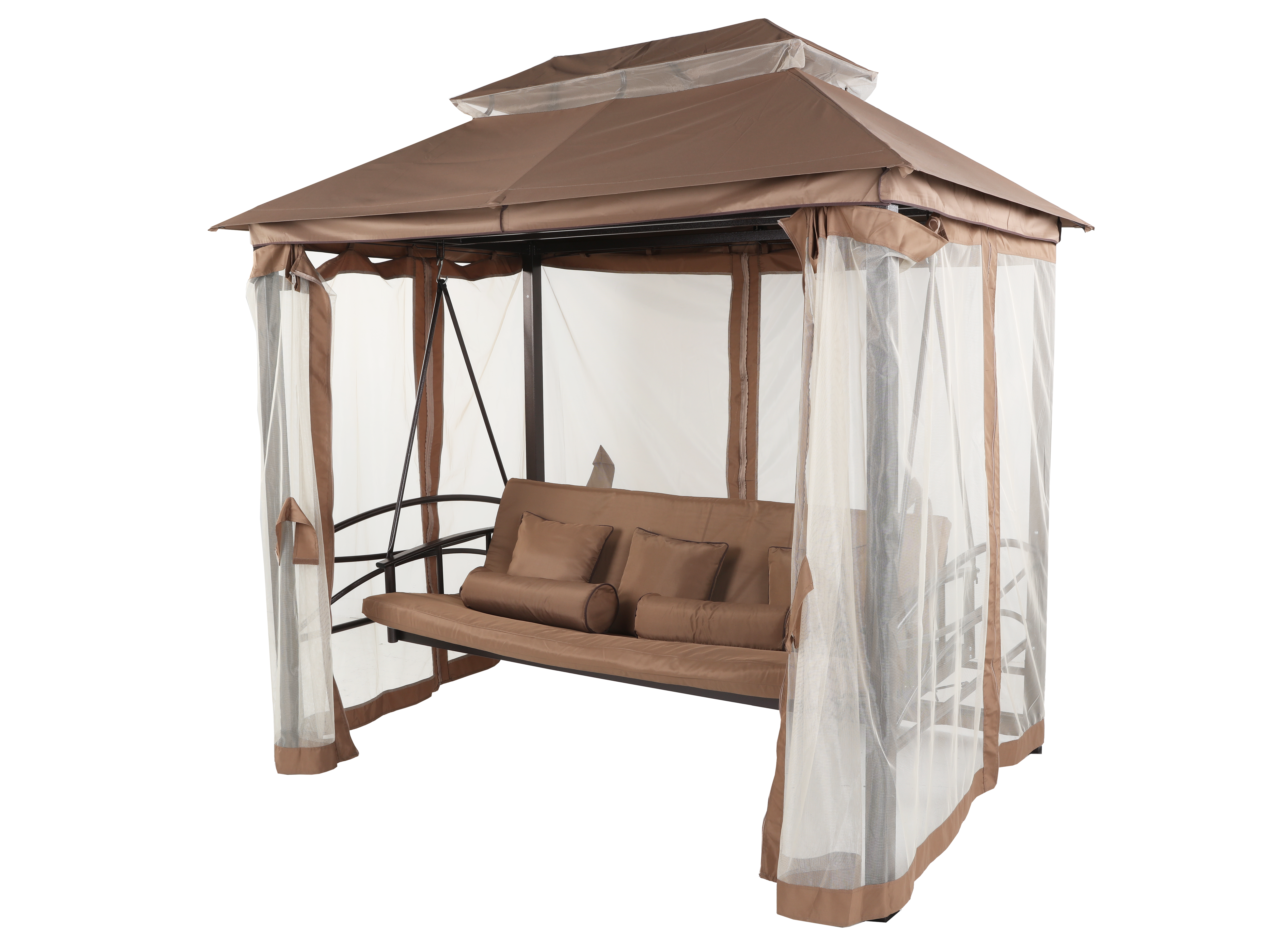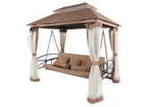 This fashionable gazebo swing bench boasts a roomy and stylish design that comfortably accommodates three individuals while providing shade from the sun through its large canopy. It serves as an excellent decoration for your garden, courtyard, and poolside, ideal for parties, barbecues, or simply relaxing. The reinforced four legs and eight ground stakes provide reliable support in any weather condition, while the waterproof and breathable PU-coated fabric is suitable for use on both hot and rainy days. The two-tier roof design ensures good air circulation, offering stability in various weather conditions, and the four zipper side walls prevent unwanted pets from entering and provide privacy.