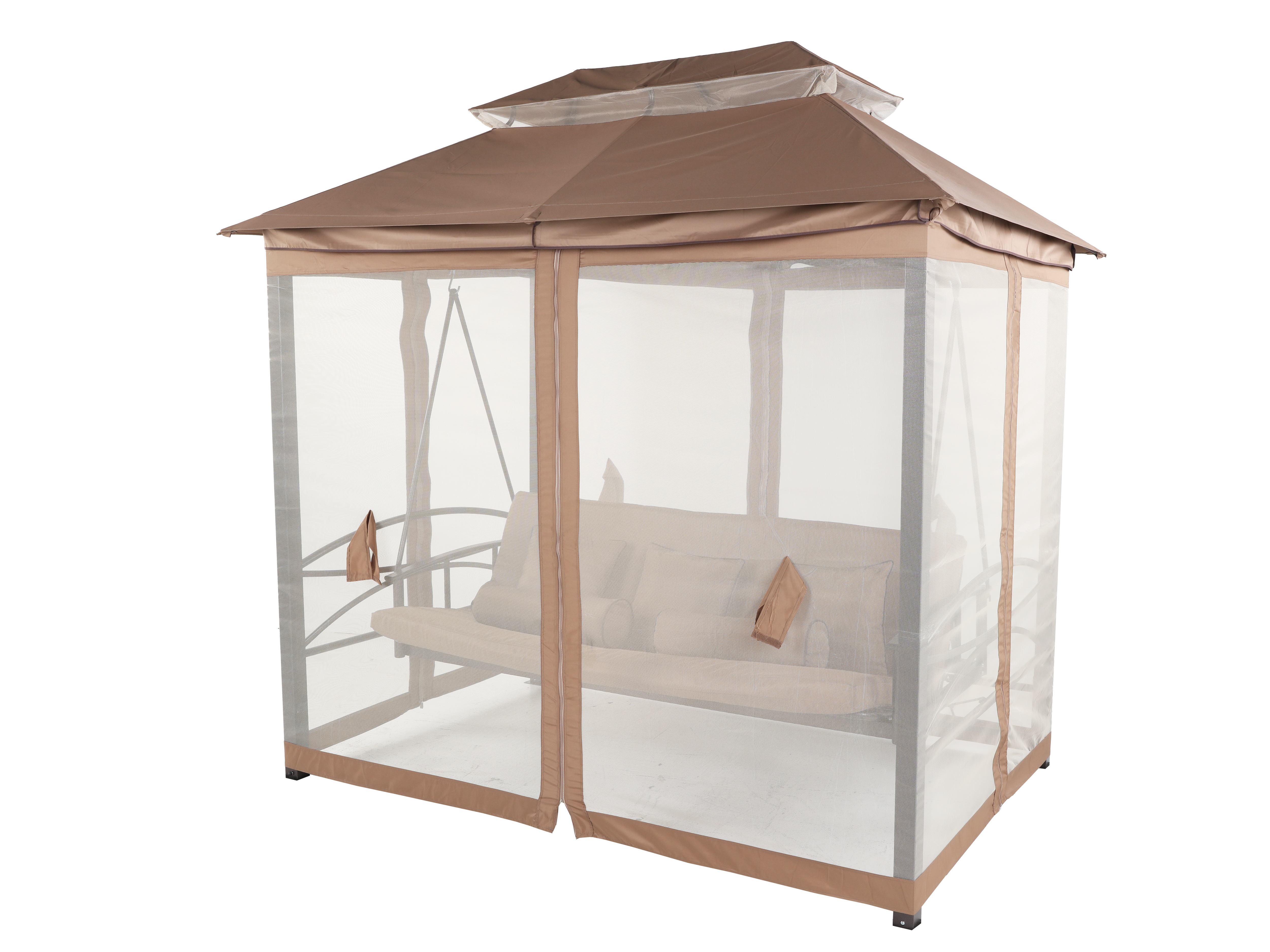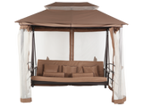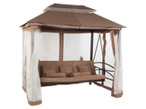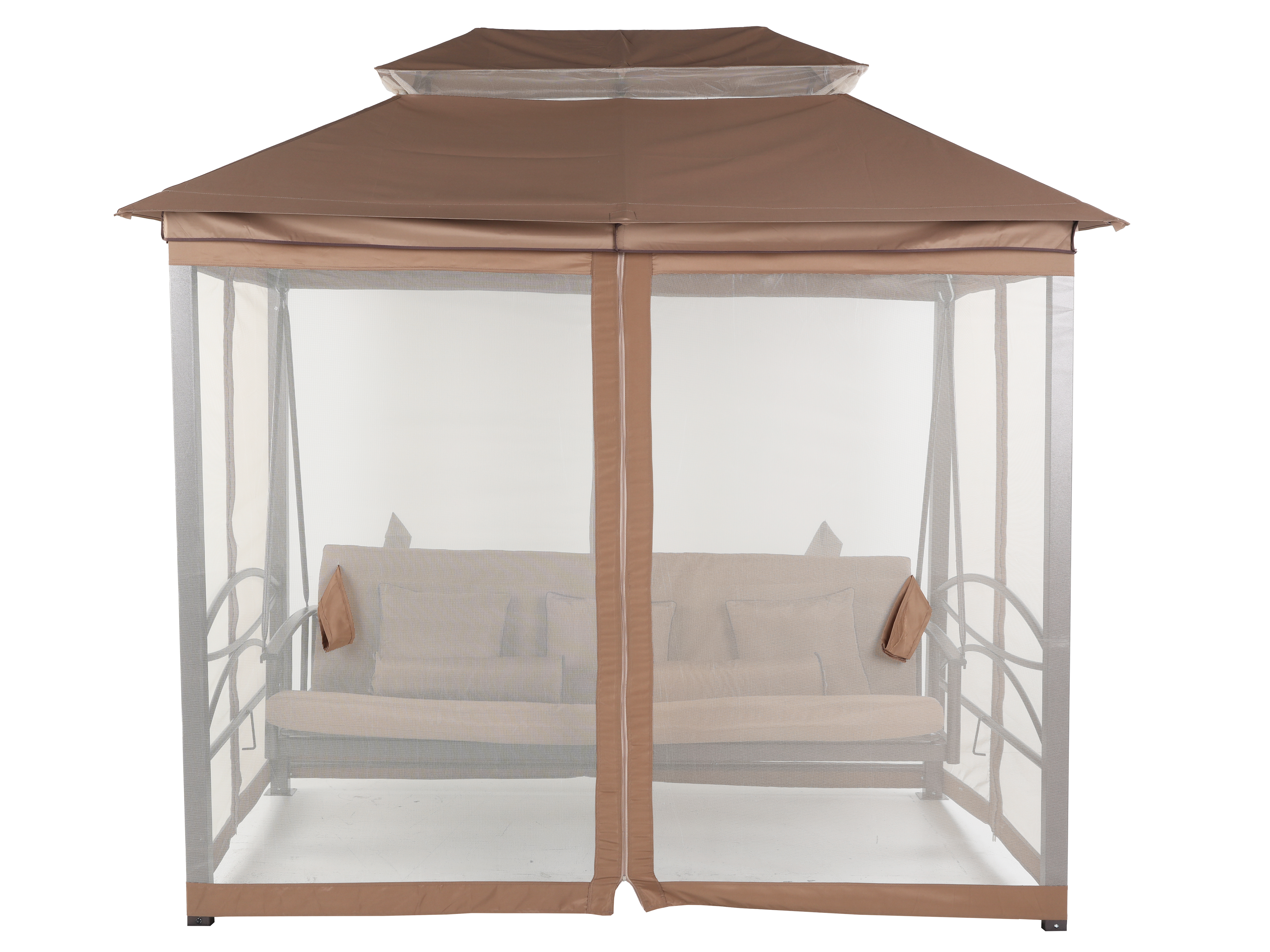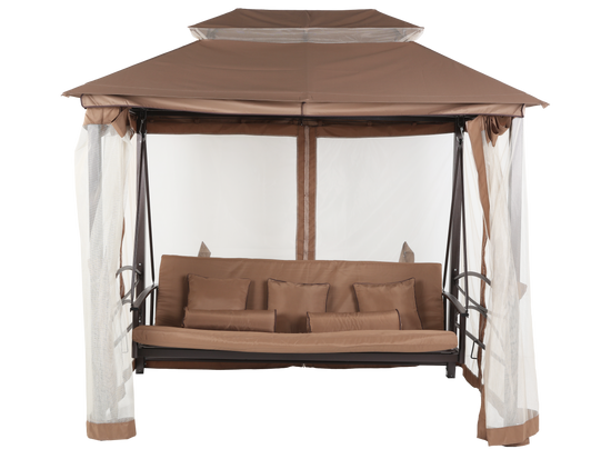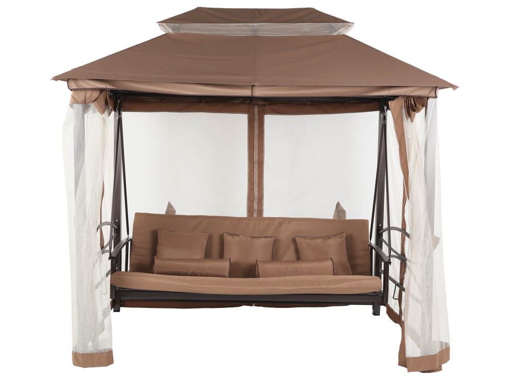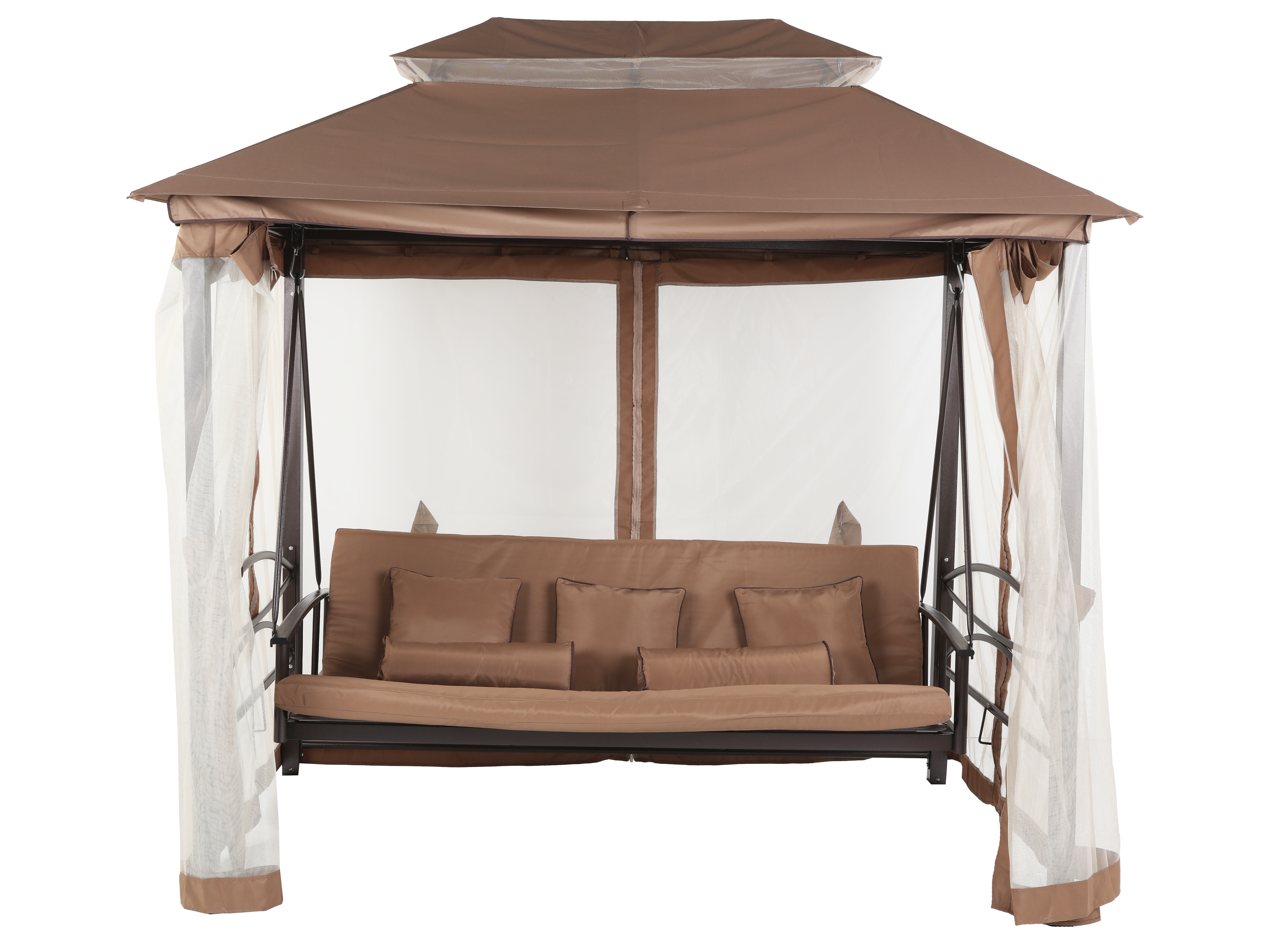 This fashionable gazebo swing bench boasts a roomy and stylish design that comfortably accommodates three individuals while providing shade from the sun through its large canopy. It serves as an excellent decoration for your garden, courtyard, and poolside, ideal for parties, barbecues, or simply relaxing. The reinforced four legs and eight ground stakes provide reliable support in any weather condition, while the waterproof and breathable PU-coated fabric is suitable for use on both hot and rainy days. The two-tier roof design ensures good air circulation, offering stability in various weather conditions, and the four zipper side walls prevent unwanted pets from entering and provide privacy.