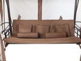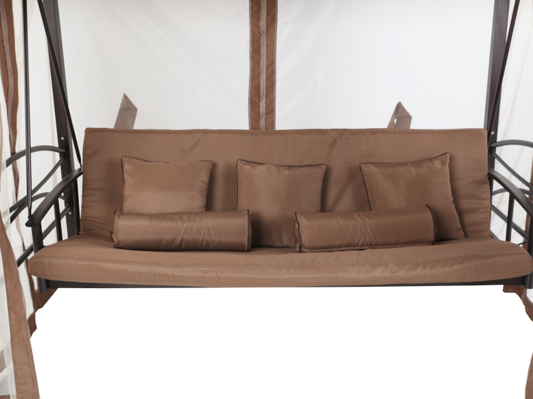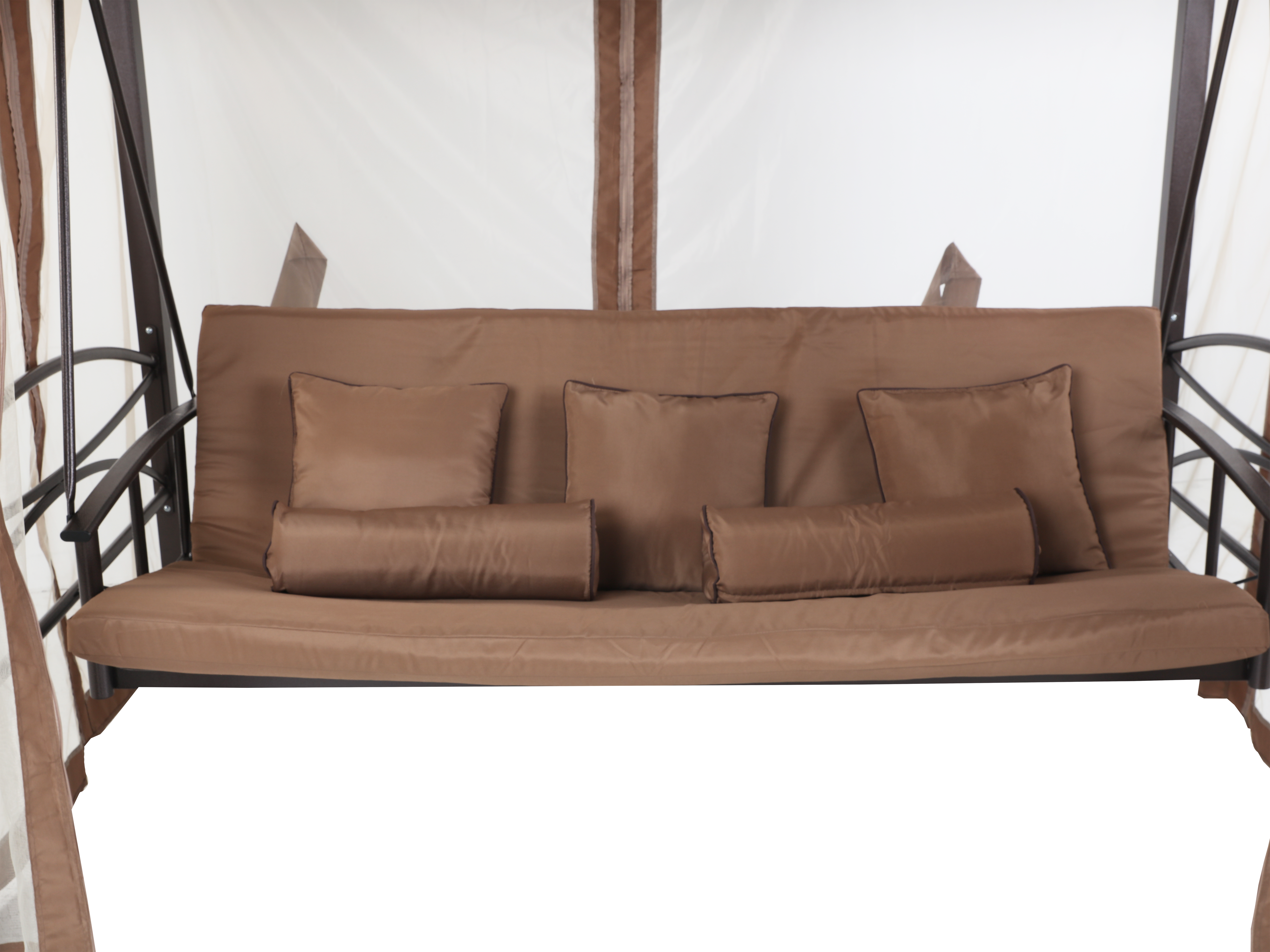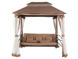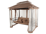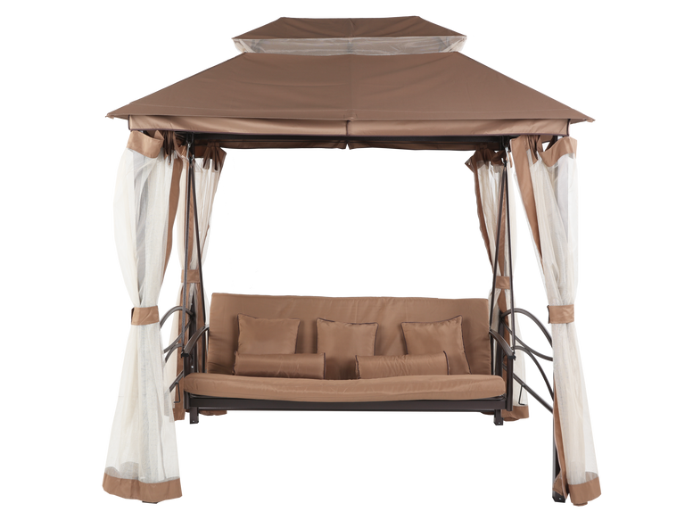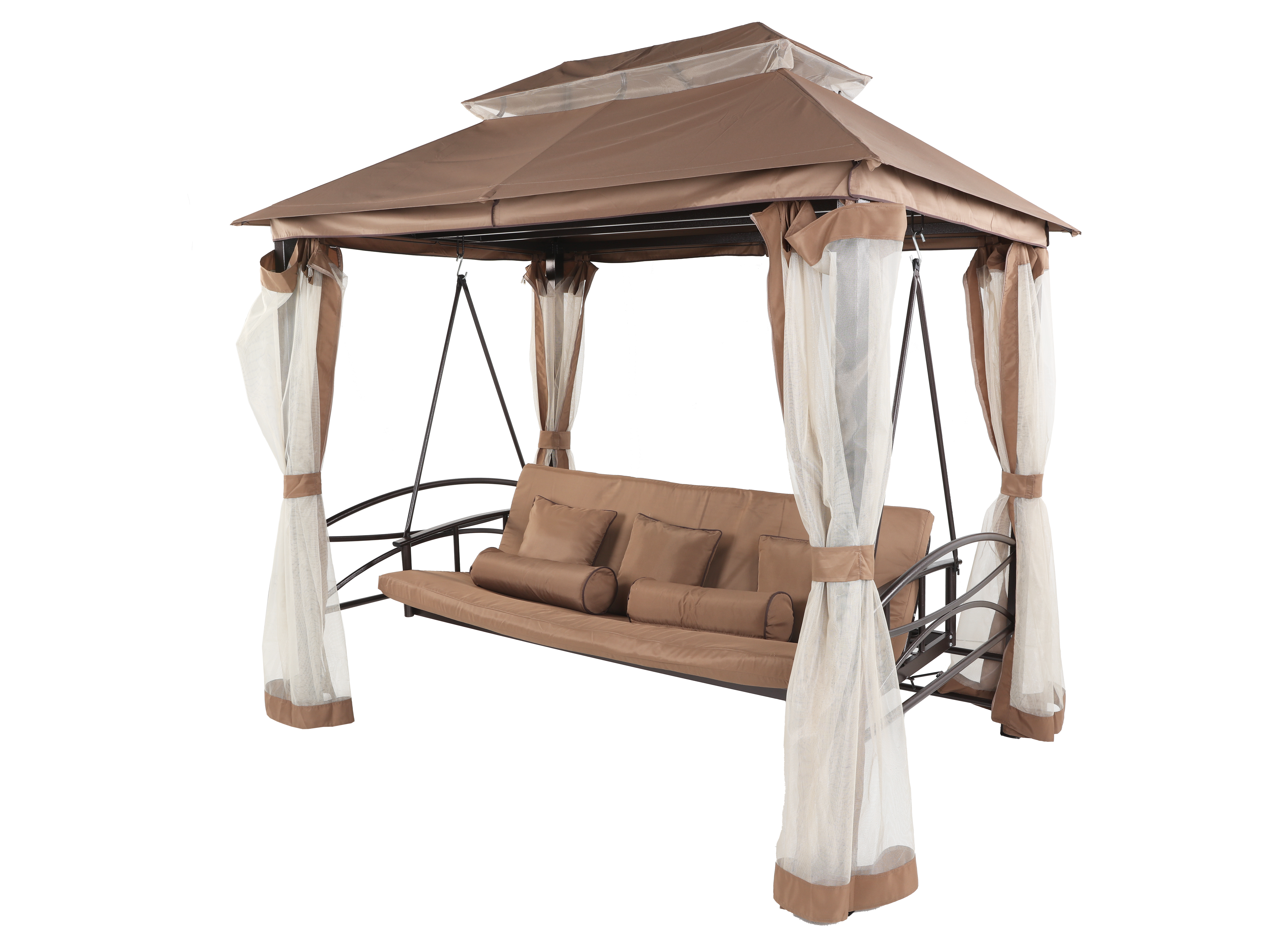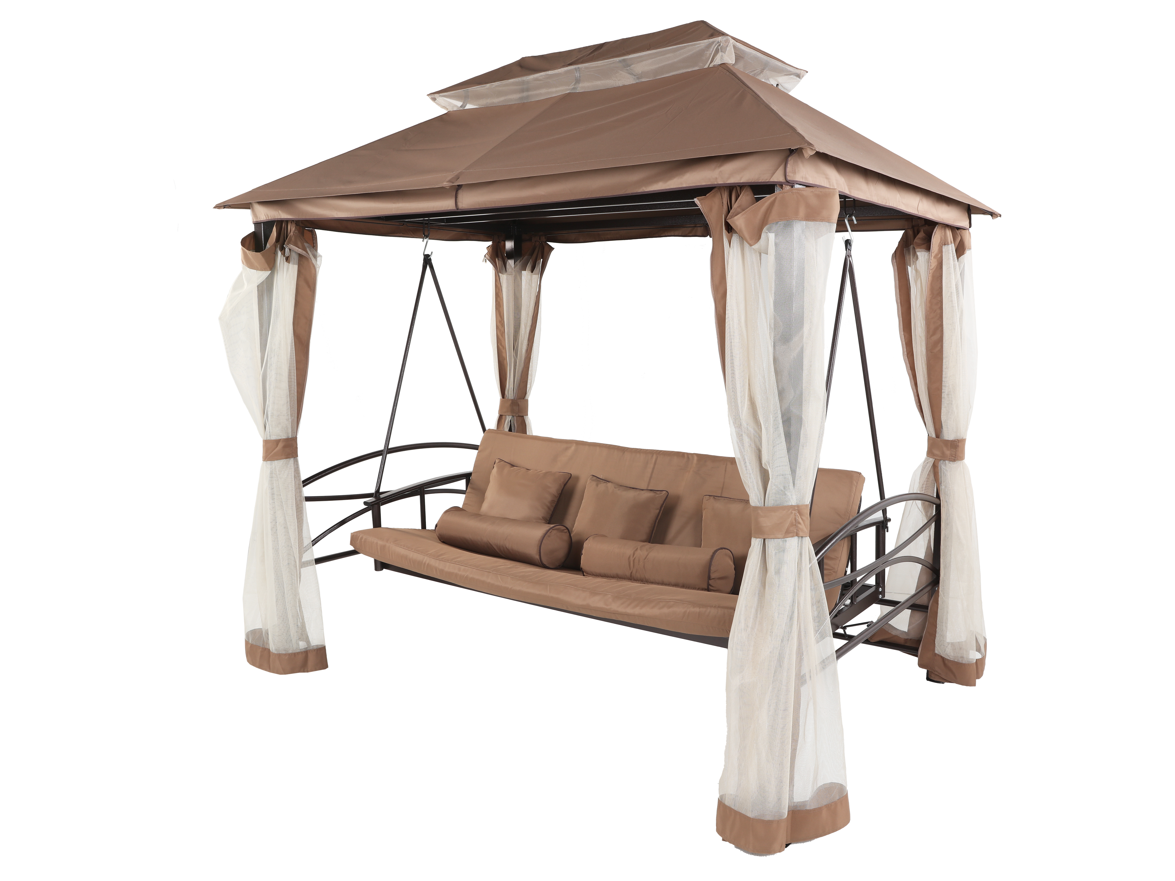 This fashionable gazebo swing bench boasts a roomy and stylish design that comfortably accommodates three individuals while providing shade from the sun through its large canopy. It serves as an excellent decoration for your garden, courtyard, and poolside, ideal for parties, barbecues, or simply relaxing. The reinforced four legs and eight ground stakes provide reliable support in any weather condition, while the waterproof and breathable PU-coated fabric is suitable for use on both hot and rainy days. The two-tier roof design ensures good air circulation, offering stability in various weather conditions, and the four zipper side walls prevent unwanted pets from entering and provide privacy.