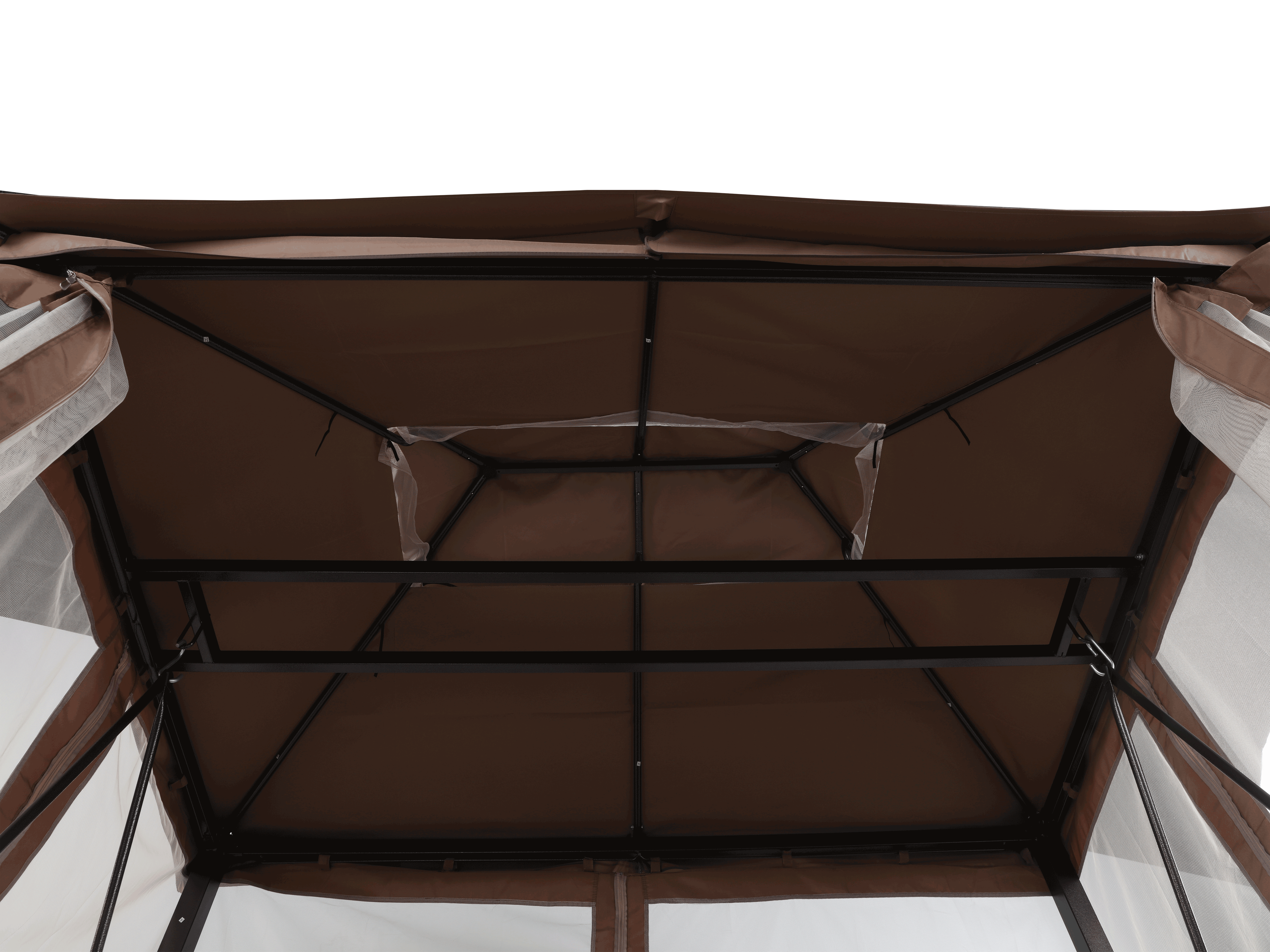 The roof is constructed from durable, weather-resistant PU-coated polyester material, making it suitable for long-term use. Its double-layer top design ensures sufficient airflow to keep cool in hot weather, and the waterproof fabric with drainage holes prevents water accumulation on rainy days. The sturdy metal frame provides stability and firmness, and the reinforced four legs ensure strong support and high security.