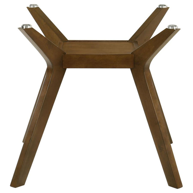Bring retro charm and modern geometry together with this mid-century inspired dining table base. Crafted from rubberwood with a warm brown finish, the design features four boomerang-shaped legs that meet at a square center shelf for visual balance and support. Ideal for pairing with a 48-inch round glass top, this base combines sturdy construction with sculptural appeal. Its clean lines and smooth contours create a stylish focal point, perfectly suited for both casual and formal dining spaces.