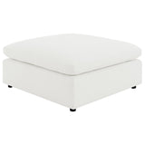 Center your relaxed living space on a modern sectional sofa, taking a laid-back approach to seating. This sofa, upholstered in tailored boucle performance fabric with topstitch details, offers a refined, contemporary style in a neutral hue, perfect for any inviting living room. Customize your seating space with modular options, allowing you to create the perfect lounging environment. The plush, feather blend filled cushions will leave you motionless in ultimate comfort, as if wrapped in airy, cloud-like seating. Wide track arms add structure to the low slung silhouette, while an included ottoman encourages relaxation and round legs provide excellent support, complete with plastic glides to protect your flooring.