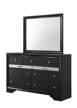 This bedroom set offers a sophisticated and cohesive look with its dark-toned wood and elegant design. The bed stands out with a high headboard featuring a shimmering silver accent, giving it a luxurious feel. The set includes a bed with storage drawers at the footboard, ideal for extra linens or out-of-season clothing, enhancing the functionality of the space. Matching pieces consist of a nightstand, chest, and a dresser with a variety of drawer sizes for optimal organization.