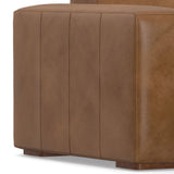 - Upholstered in Caramel Brown Kind Leather, a high-quality, genuine aniline, Brazilian leather made through an environmentally friendly process that minimizes waste and maximizes the natural color and grain of the leather.