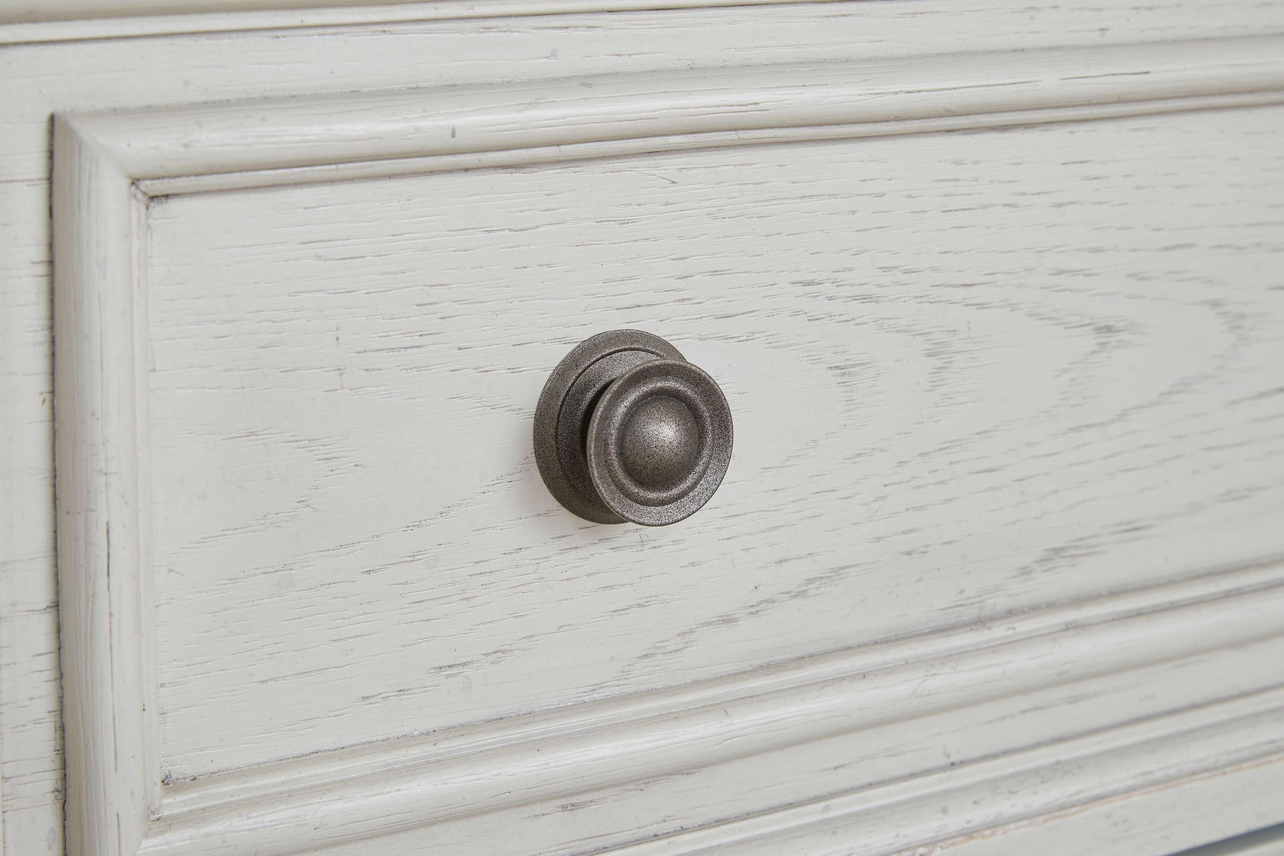 Elegant, timeless furnishings take your bedroom to the next level. Nothing does that better than this chest. The antiqued white finish with a wonderful grain texture radiates sophistication, while the dark bronze-tone hardware adds an ornate touch. A felt-lined top drawer rounds out the piece for the ultimate tasteful bedroom.