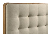 Bring countryside charm to your bedroom with this mid-century-inspired bed, expertly crafted from pine, engineered wood, and walnut veneer for durability and style. The upholstered headboard features thick padding and square tufting for a touch of elegance and comfort, while the sleek, low-profile footboard completes the refined silhouette. Rounded corners and tapered legs highlight the retro-modern design, and its elevated frame adds a clean, airy look. Perfect for creating a serene and stylish bedroom retreat.
