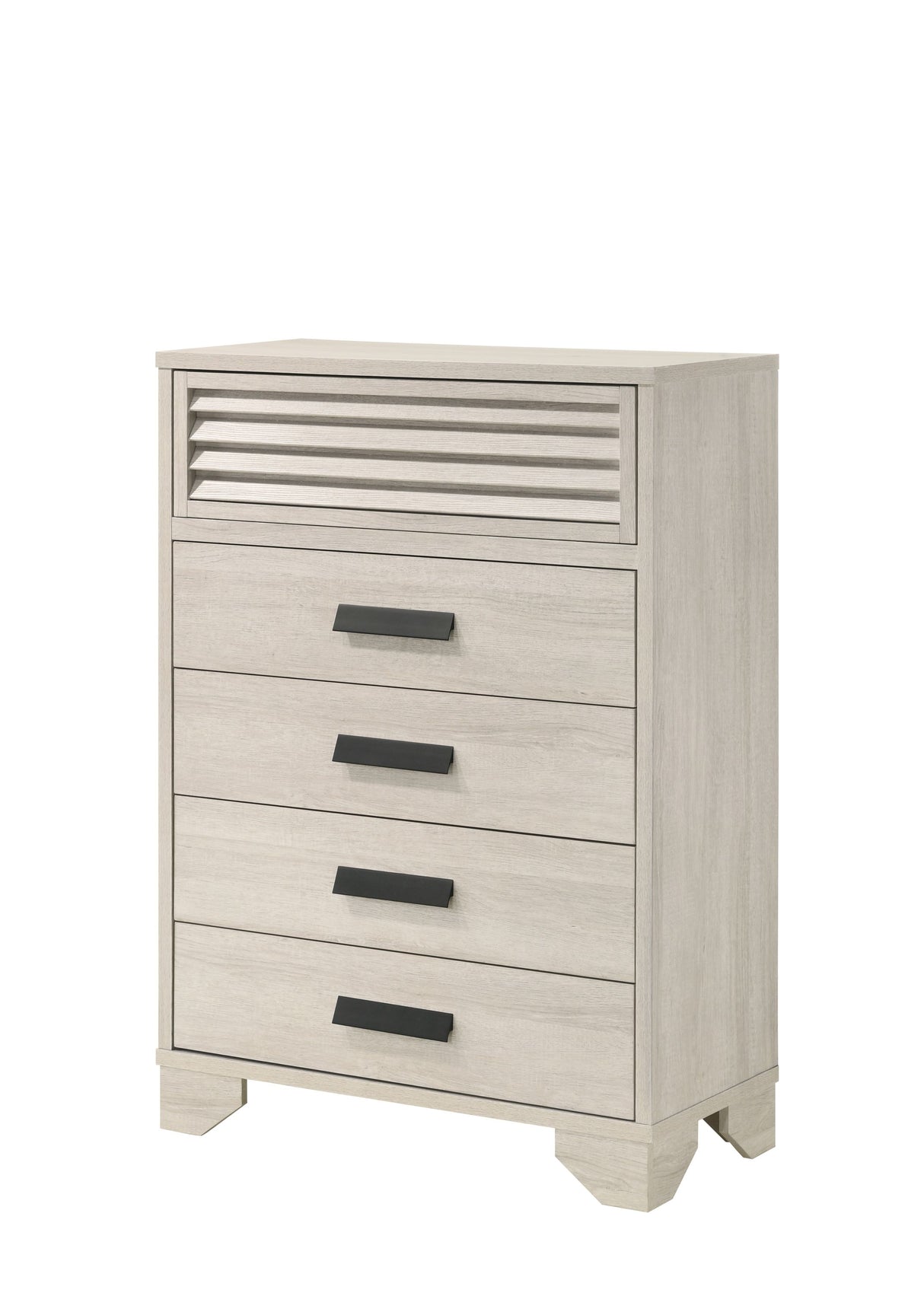 This bedroom collection radiates contemporary charm with its light wood finish and minimalist design. The bed, with its clean lines and louvered headboard, offers a modern twist on a classic design, creating a serene focal point in the room. Complementary pieces include a spacious dresser topped with a large mirror that adds depth and brightness to the space, a tall chest providing ample vertical storage, and a nightstand with convenient bedside access. Each piece is accented with sleek, dark hardware that stands out against the light finish, adding a subtle contrast that is both striking and elegant.
