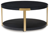 Reflect your cool, contemporary eye for design with this table set. Pairing a gleaming goldtone finish and black wood grain pattern, it crafts a luxe look for your living room. The lower shelves are well-suited for displaying your favorite decor, while casters on the coffee table offer added flexibility.