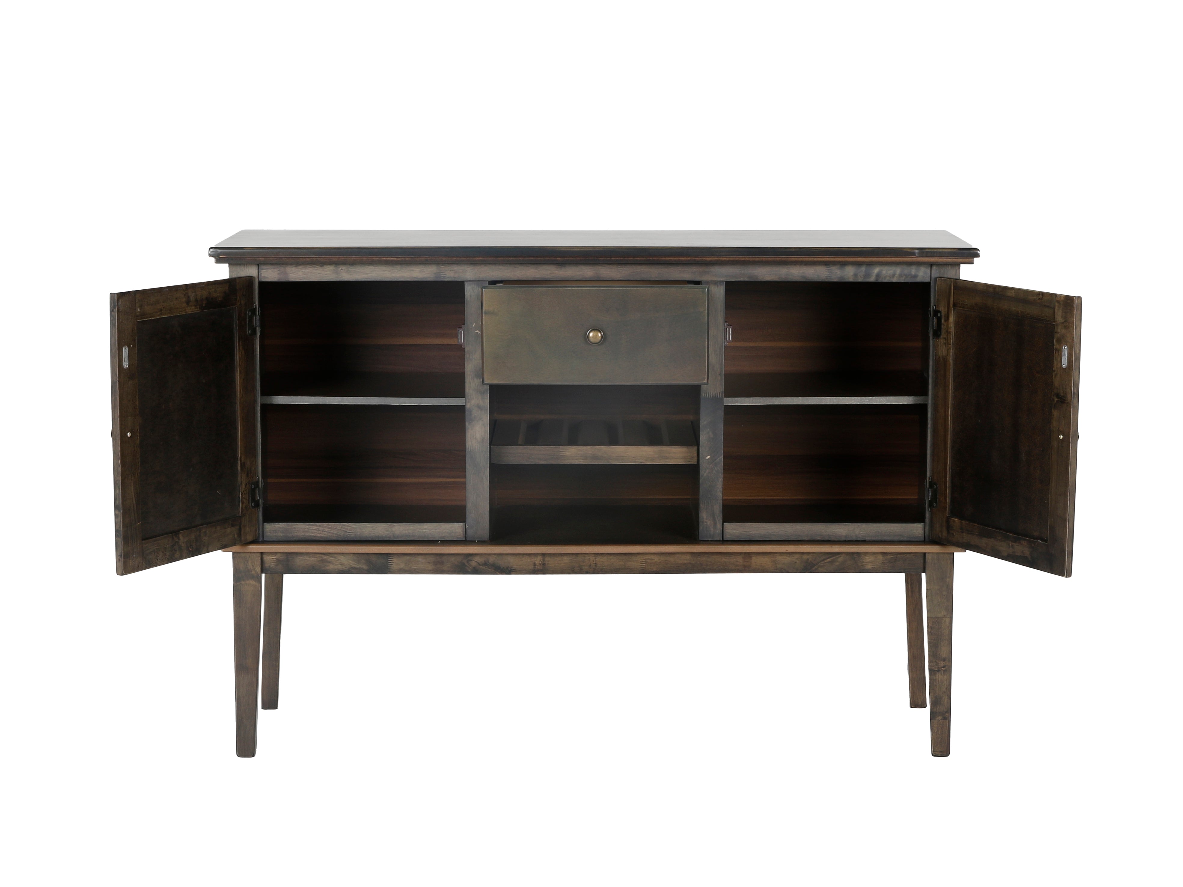 With its transitional styling, this collection cleverly combines classic design elements to form a captivating look that serves as the perfect foundation for your casual dining room's decorative versatility. The finish applied over the mango veneer accentuates the natural grain of the wood, adding depth and character. Enhancing both functionality and organization, the server offers additional storage space. Its drawers and behind-door compartments allow for neat arrangement of tabletop accessories, while the wine rack and wine glass storage provide an open display for your wine collection. The drawers and doors of the server are adorned with antique brass finished knob hardware, creating a pleasing contrast that beautifully complements the overall finish of the collection.
