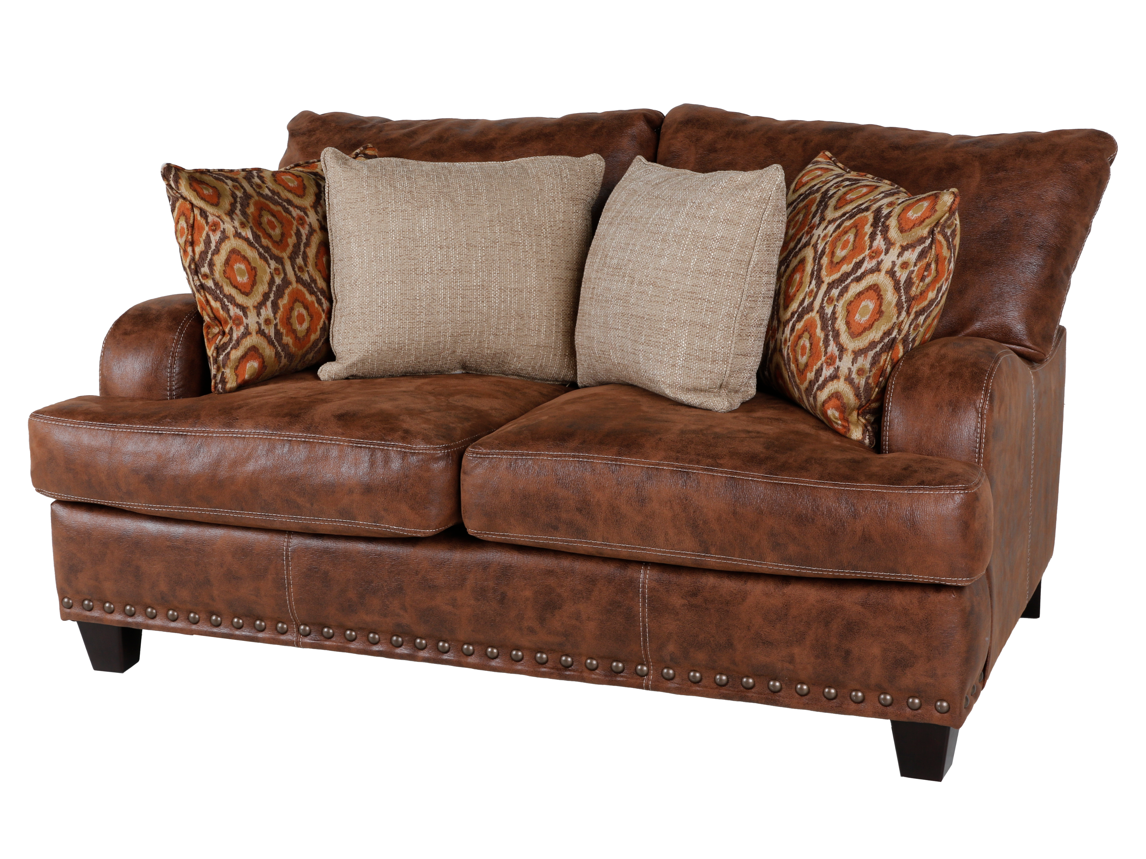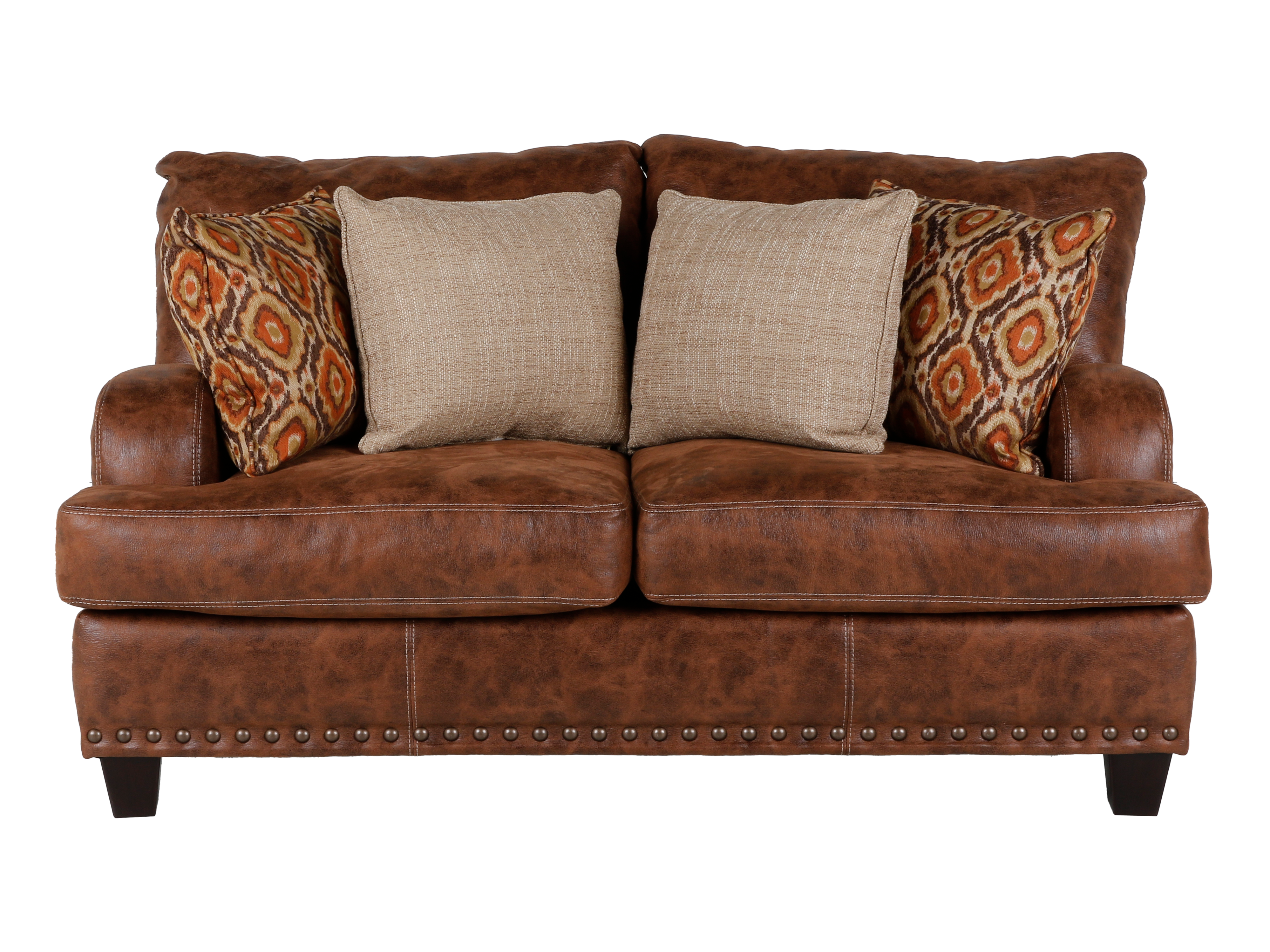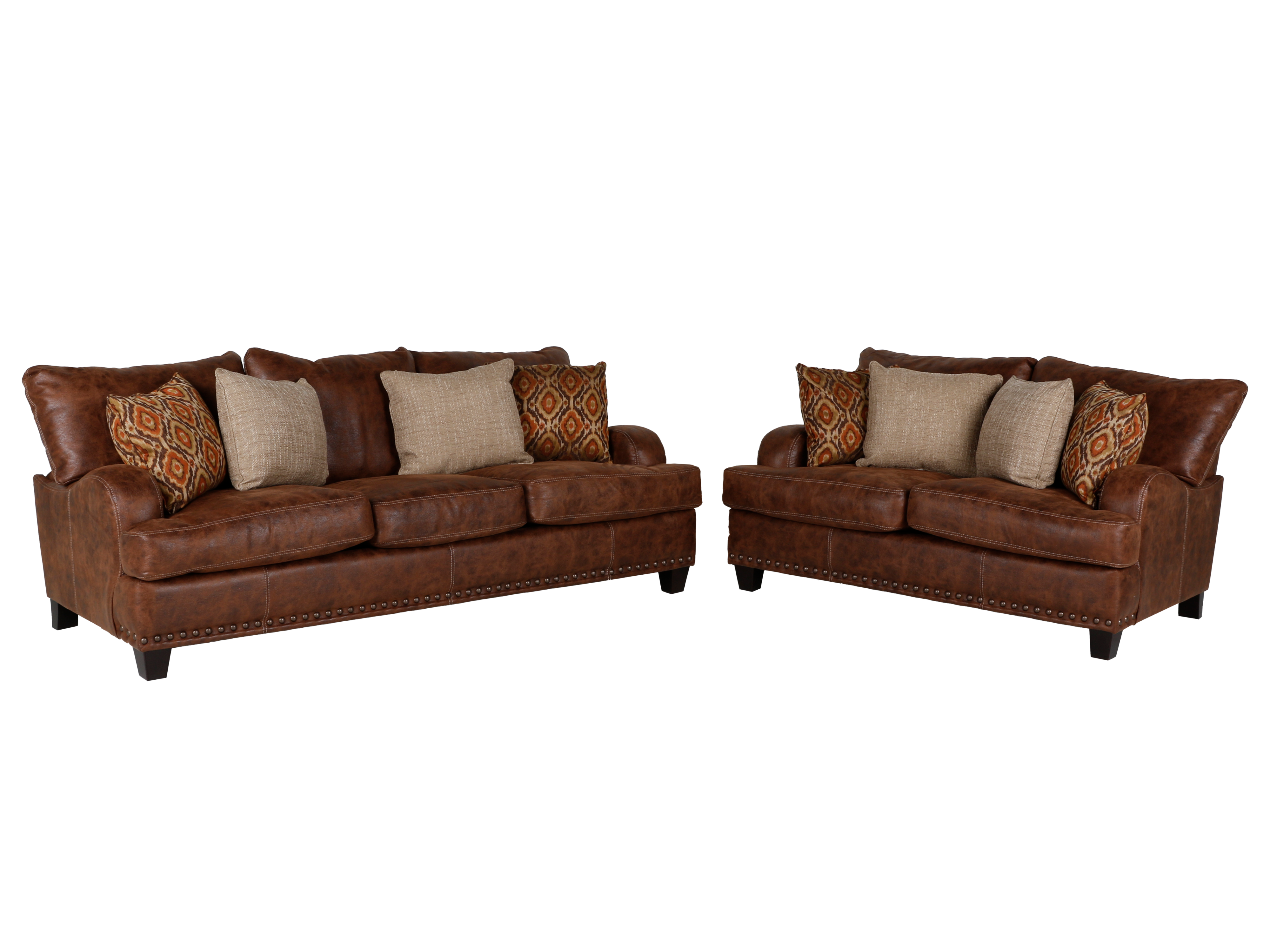 This sofa and loveseat set offers a classic look with its swoop track arm design, dark cherry high legs, and antique brass nails. This collection also features reversible seat and back cushions for increased comfort and durability. Seat cushions are extra thick and designed for plush, sink-into comfort.