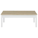 An updated version of farmhouse style is soft and easy on the eyes as this three-piece wood coffee table set is a viable option for your family room or living room. Casual and yet nicely designed, this set offers a versatile finish palette of distressed pine and white over wood products. Clean lines add an easy optical effect. Make your space a simple yet stylish venue with tables designed to last through redesigns. Set includes one rectangular coffee table and two end tables.