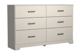 With its clean-lined look and modern attitude, this dresser is a fresh style awakening. A crisp, white hue over subtle replicated wood grain easily complements other furniture finishes. Smooth drawer fronts with antiqued pewter-tone handles complete the aesthetic.