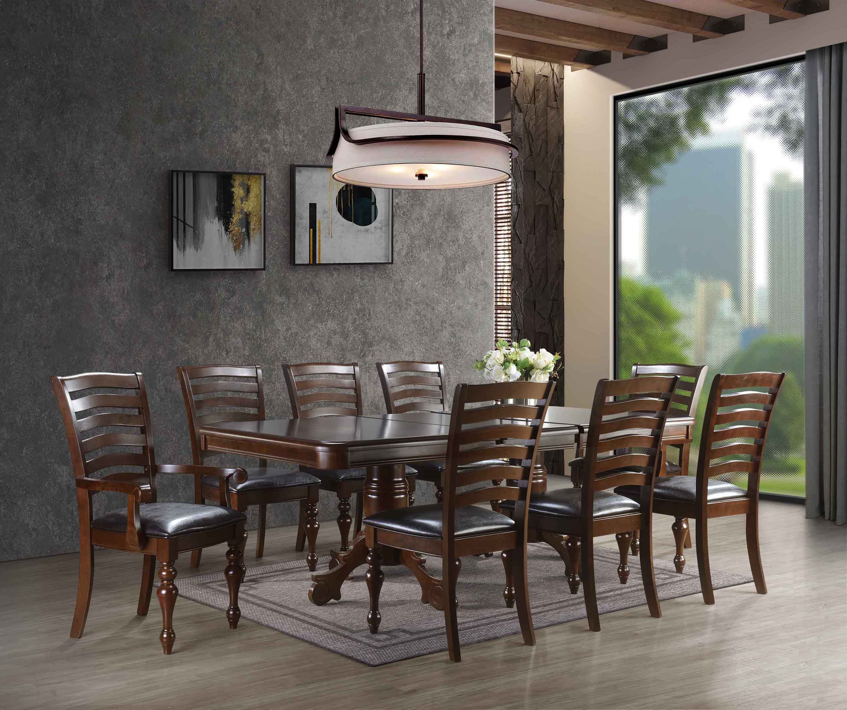 Discover the essence of timeless elegance with this captivating rectangular dining table and 8-chair set, where attention to detail creates a truly remarkable aesthetic. For added convenience, the table also includes an 18-inch extension leaf, allowing you to accommodate larger gatherings with ease. Designed in a traditional style, this chair offers a padded seat that ensures optimal comfort during dining experiences. The seat is gracefully upholstered in a smooth leatherette. Indulge in the intricate details and classic charm of this dining set, where every element harmoniously contributes to its overall allure. With its inviting ambiance and tasteful design, this set promises to enhance your dining space and create an atmosphere of enduring elegance.