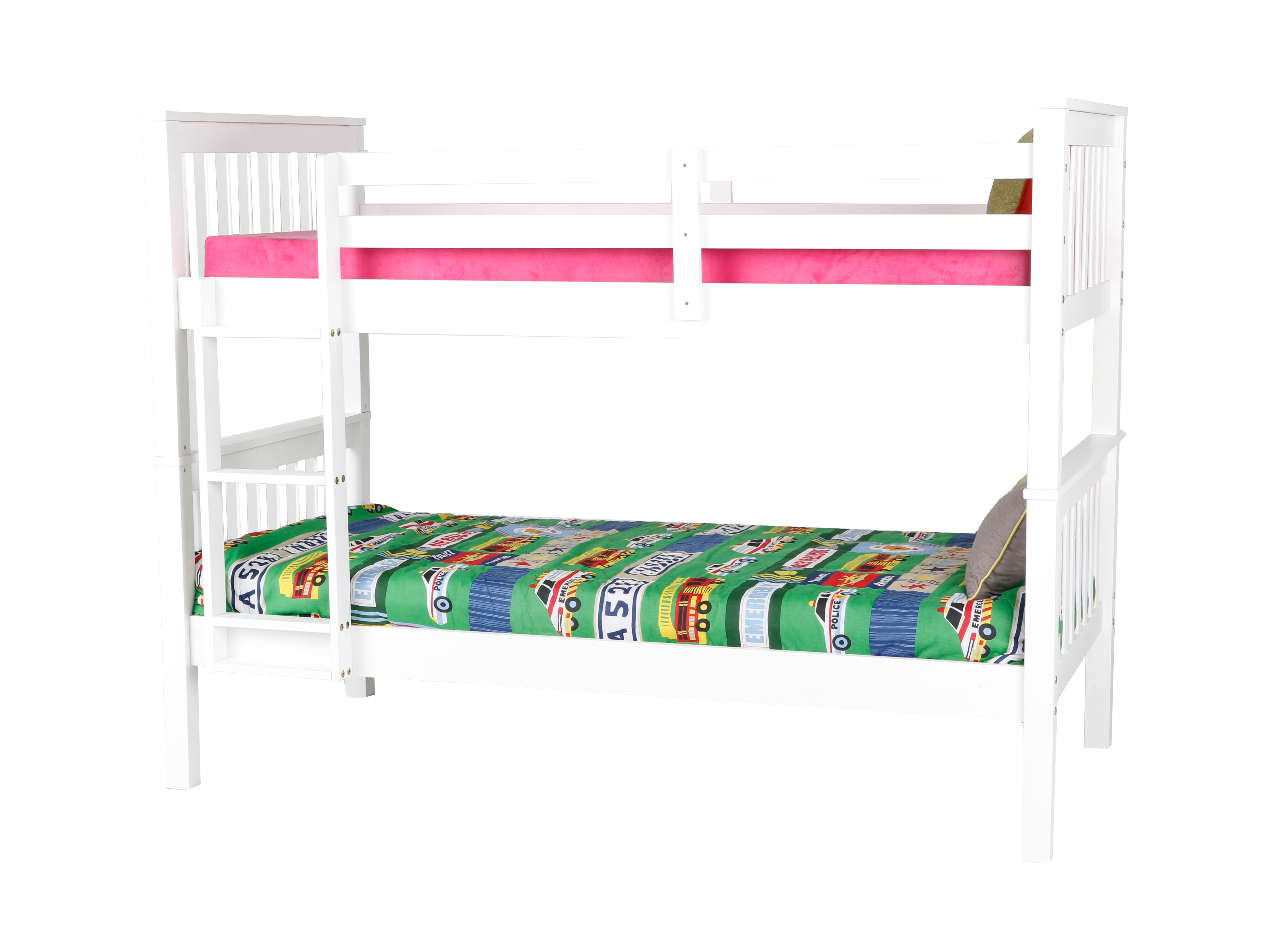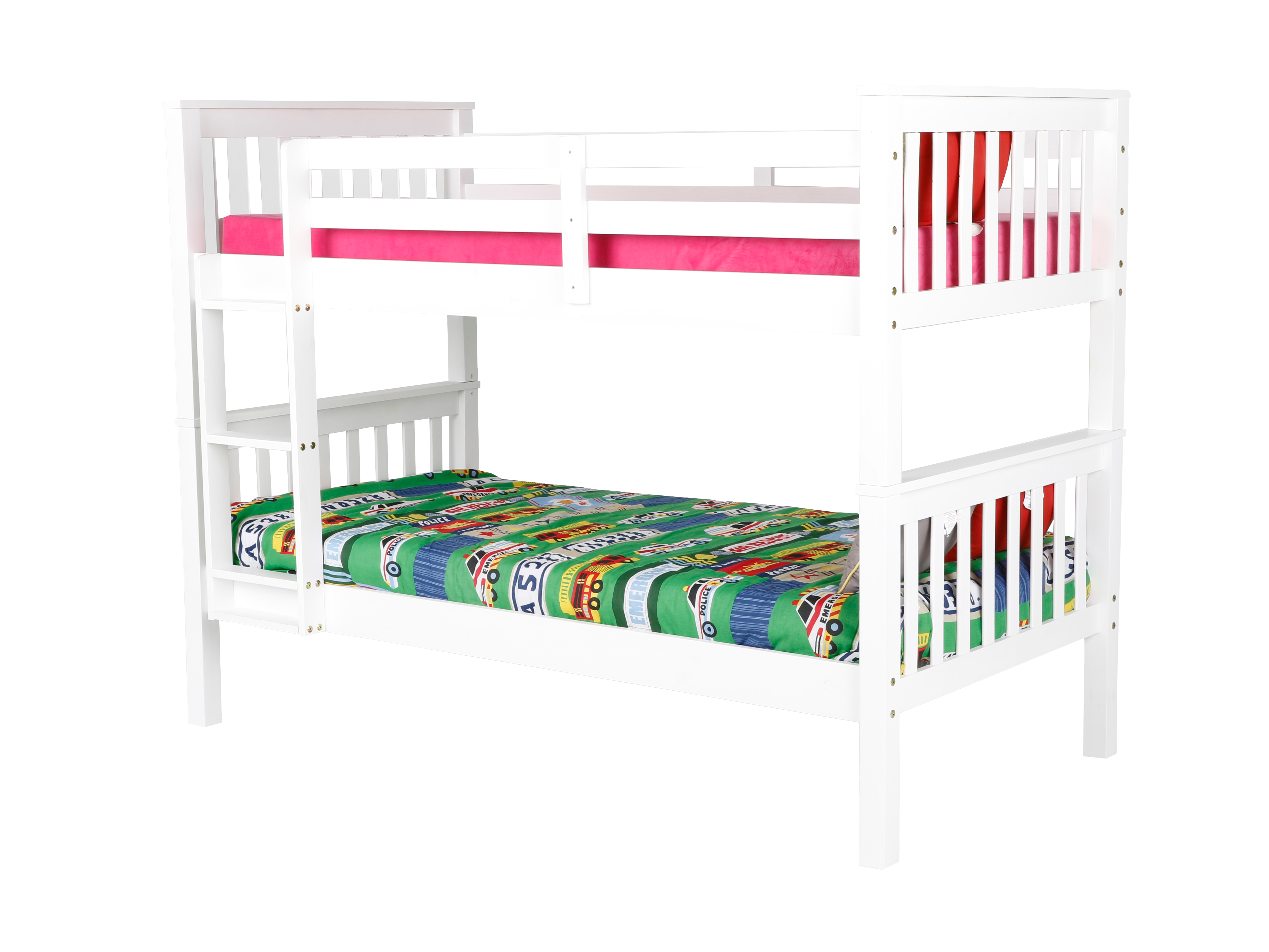 - Built-in end ladder; full-length guardrails on the upper bunk