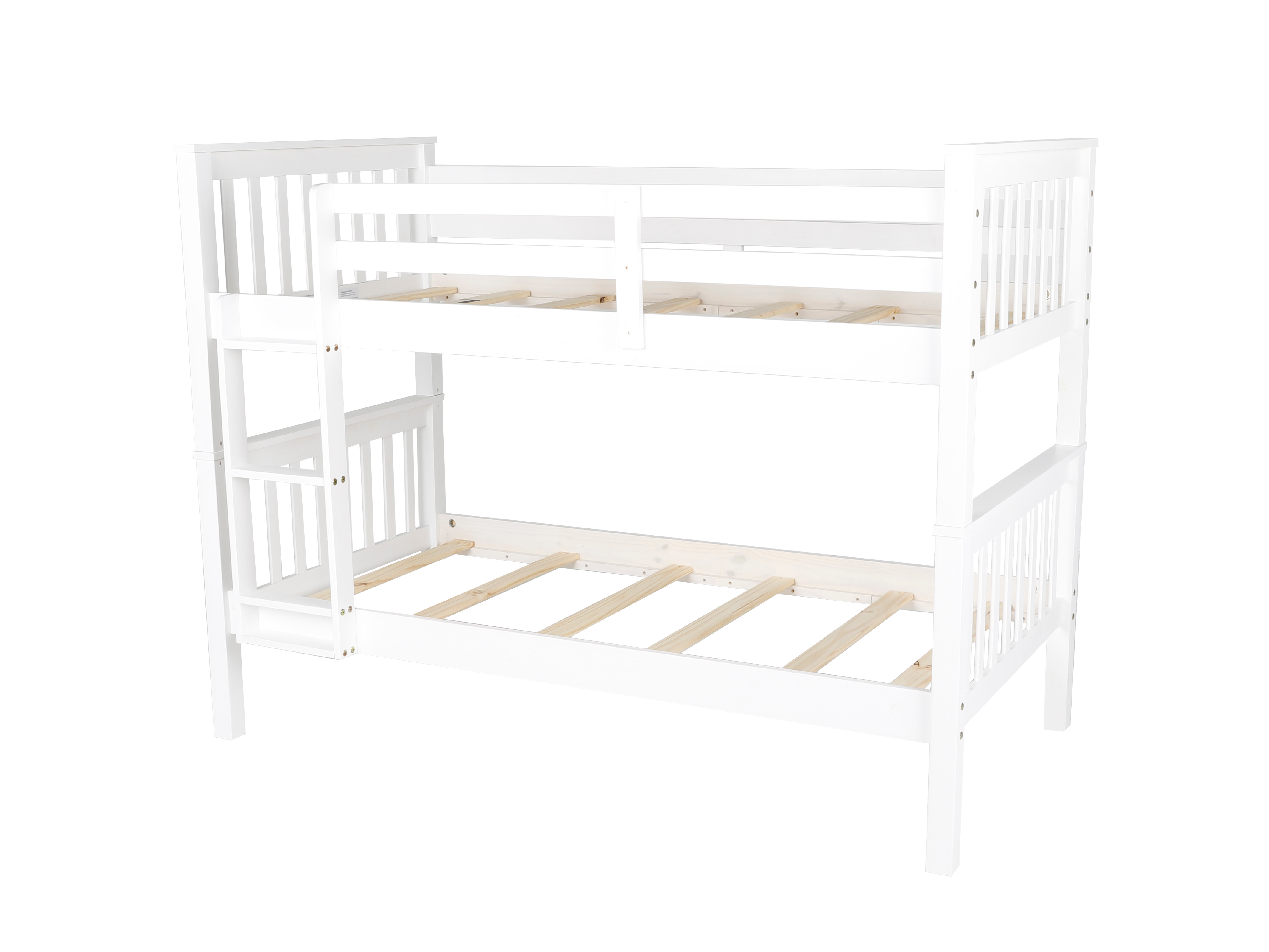 Save floor space without giving up style. This twin-over-twin bunk bed features a crisp white finish with clean slat details and a built-in end ladder that keeps the footprint compact for smaller rooms. Full-length guardrails on the top bunk and a sturdy wood slat system on both bunks provide secure, breathable support (bunkie board required). Designed to fit two standard twin mattresses, it’s a practical upgrade for siblings, sleepovers, or a guest room that needs flexible sleeping space.